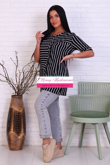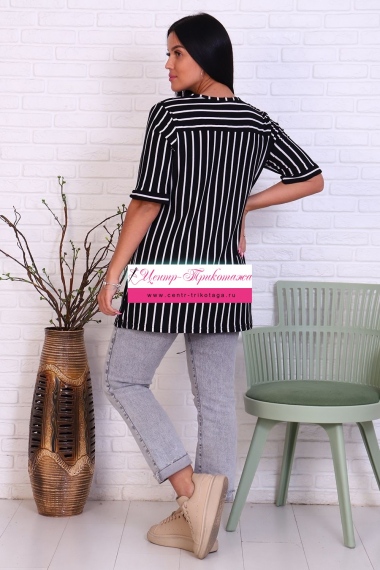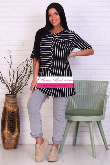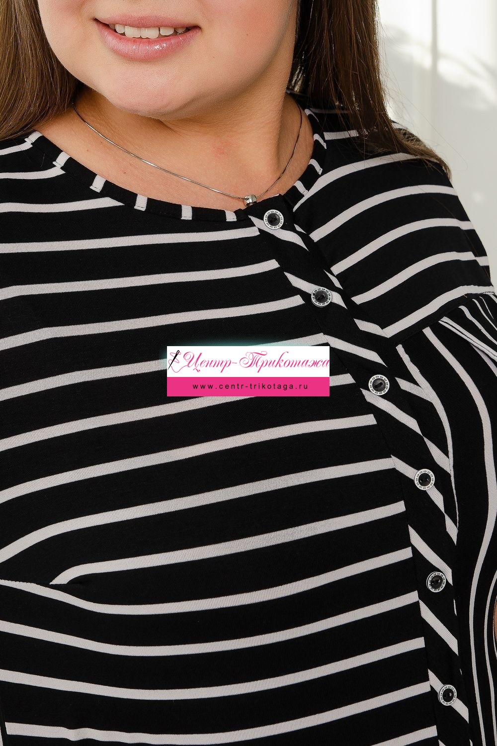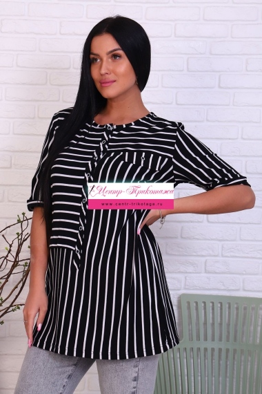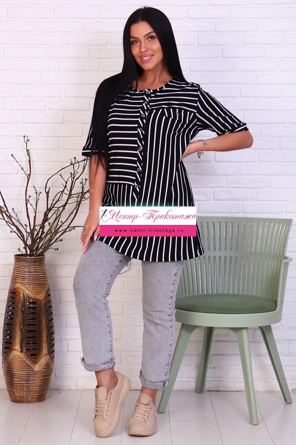 Стильная полосатая туника из вискозы. Короткие рукава, застегивается на пуговицы, на груди декоративный клапан кармана, дизайн в виде светлых и темных полосок. Размеры от 52 до 62.