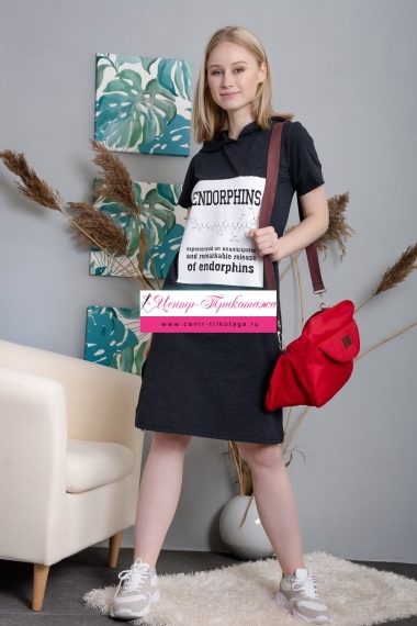 Молодежная туника из кулирки с капюшоном, с разрезом по бокам, печать на спине и на передней части, короткие рукава с манжетами