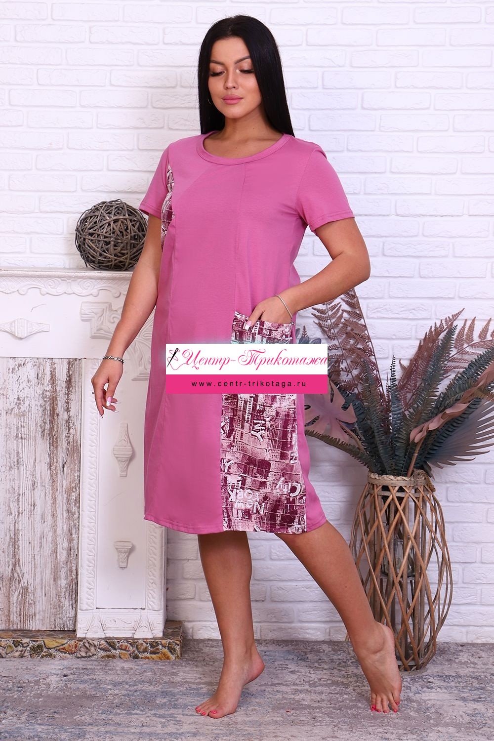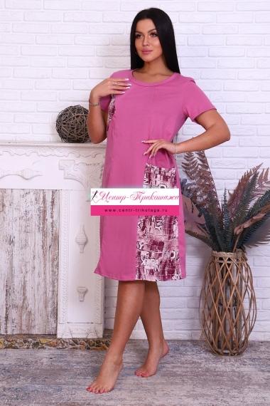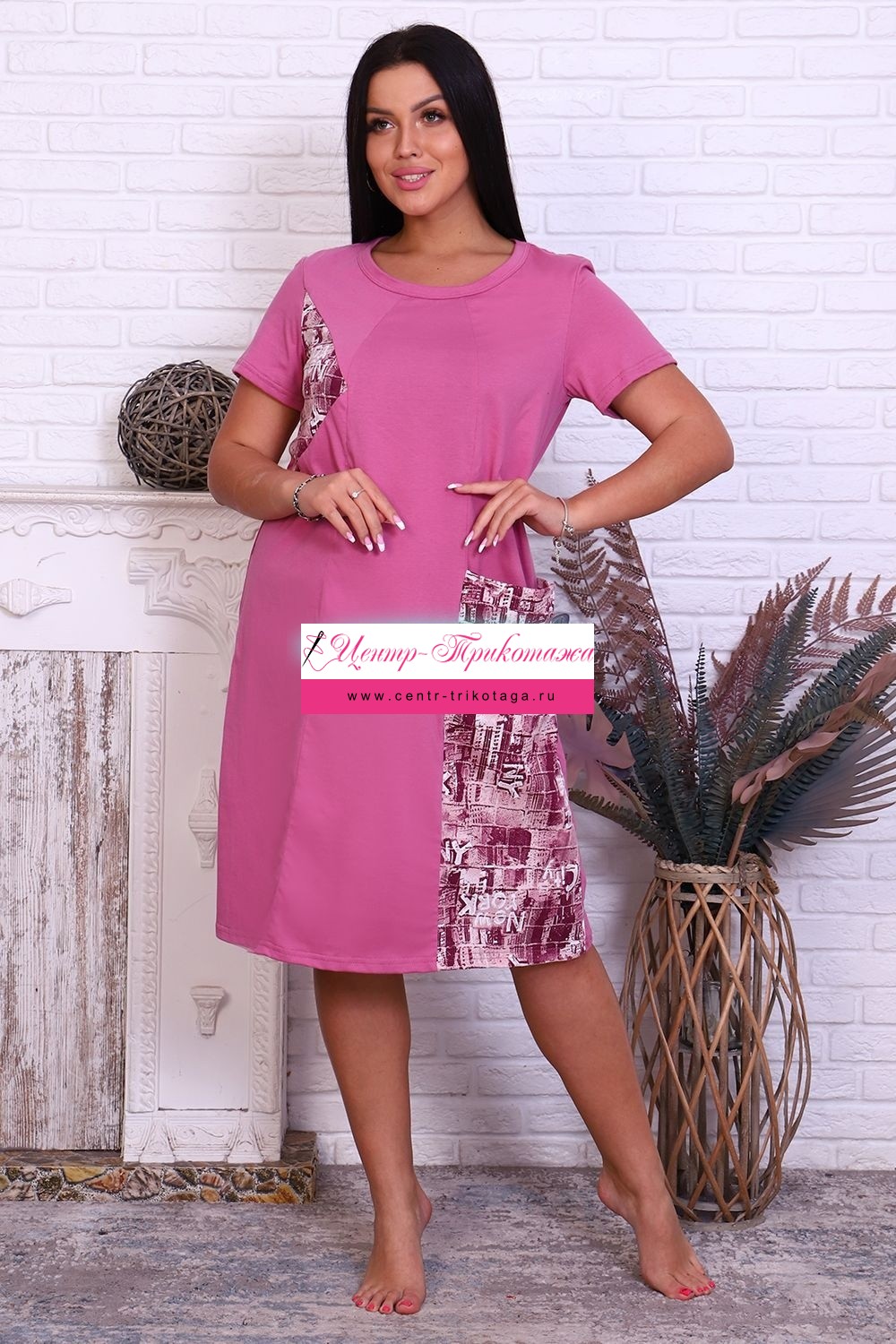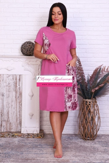 Женская туника из кулирки. Средняя длина, короткий рукав, отделка и большой карман из набивной ткани