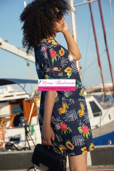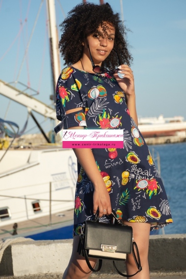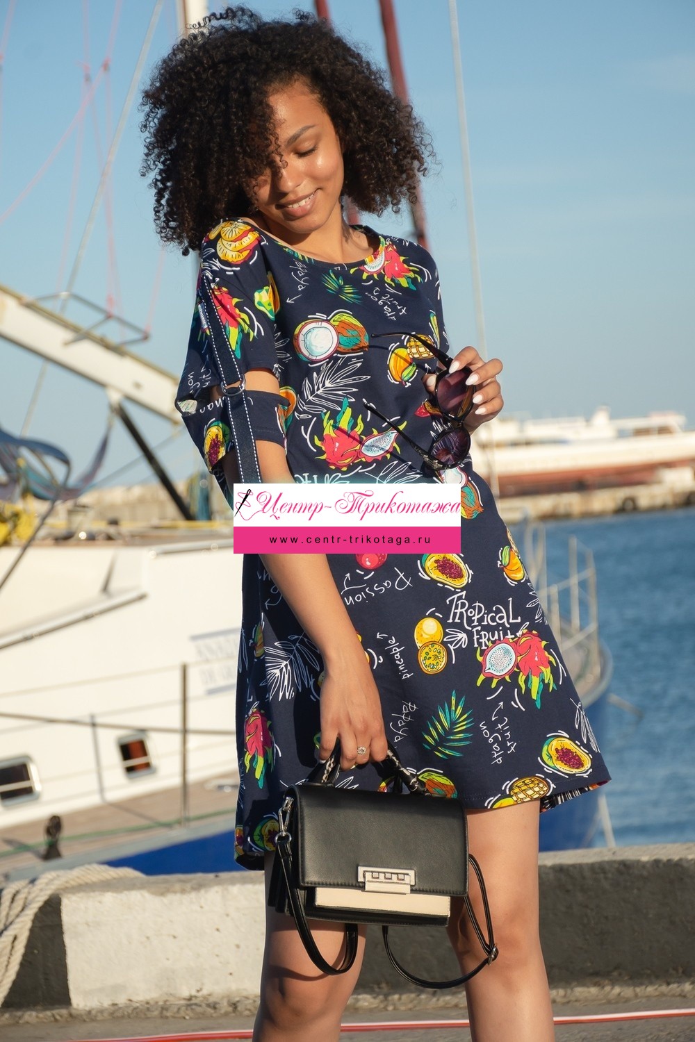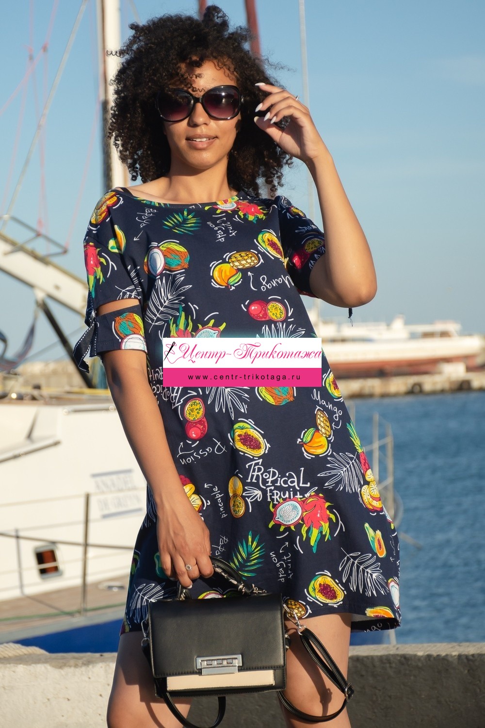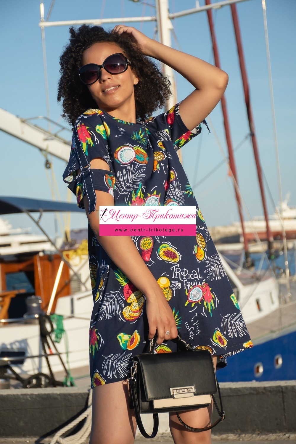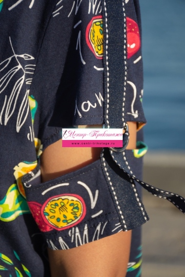 Женская туника А - образного силуэта с боковыми карманами выполнена из 100% хлопчатобумажного трикотажного полотна с тропическим рисунком. Горловина окантована, а интересный рукав с разрезом, металлическими полукольцами и декоративной лентой, позволяет создать изысканный образ, как в повседневной жизни, так и на отдыхе.
