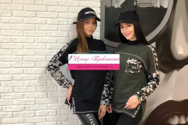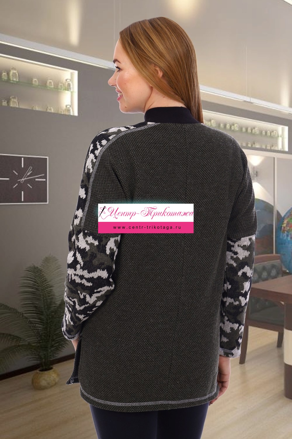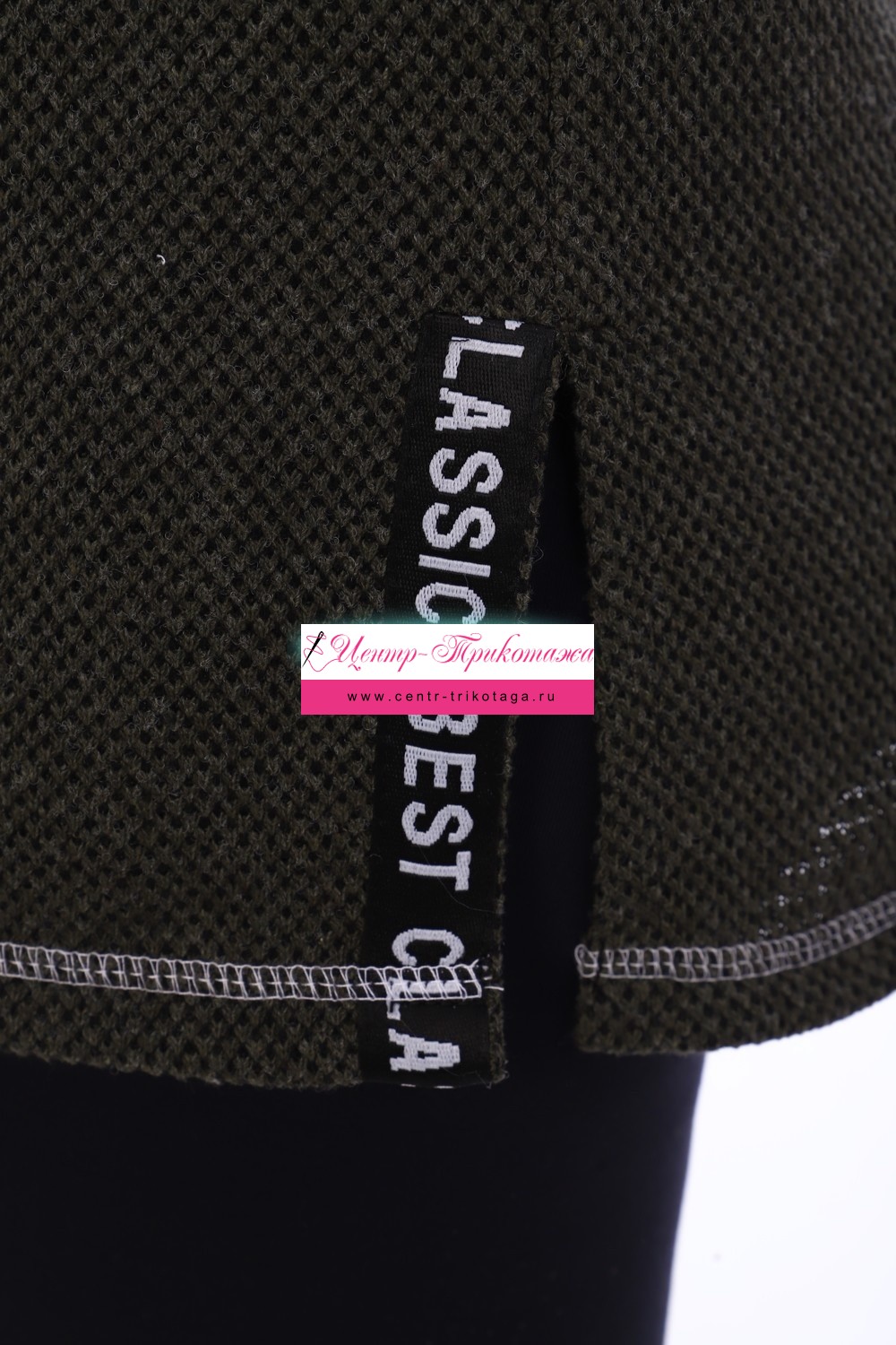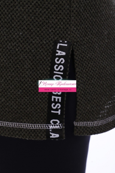Туника женская прямого силуэта. Рукав цельнокроенный со швом. Воротник-стойка из кашкорсе. На полочке кокетка и нагрудный накладной карман, по плечевому шву лампас, по боковому шву разрезы. Вдоль линии разреза на полочке на кармане настрочена репсовая тесьма с буквами. Туника из однотонной ткани Пике , плечевые лампасы, рукава, карман из ткани Жакке с модным сейчас принтом камуфляж.