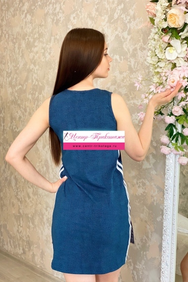 Туника-майка в спортивном стиле, полуприлегающего силуэта средней длины, с V-образной горловиной, без рукавов. Полочка с симметричными кокетками в верхней части. Средняя часть полочки выполнена из сетки. Вдоль боковых швов расположены вставки с лампасами из отделочного полотна. Горловина и проймы обработаны бейкой из основного полотна.