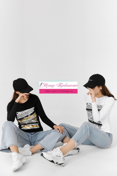 Туника полуприлегающего силуэта, с округлой горловиной, длиной до середины бедра. Рукав втачной, длинный. Горловина обработана бейкой из основного полотна. На полочке большая красивая печать с золотым или серебряным глиттером, декорированная пайетками