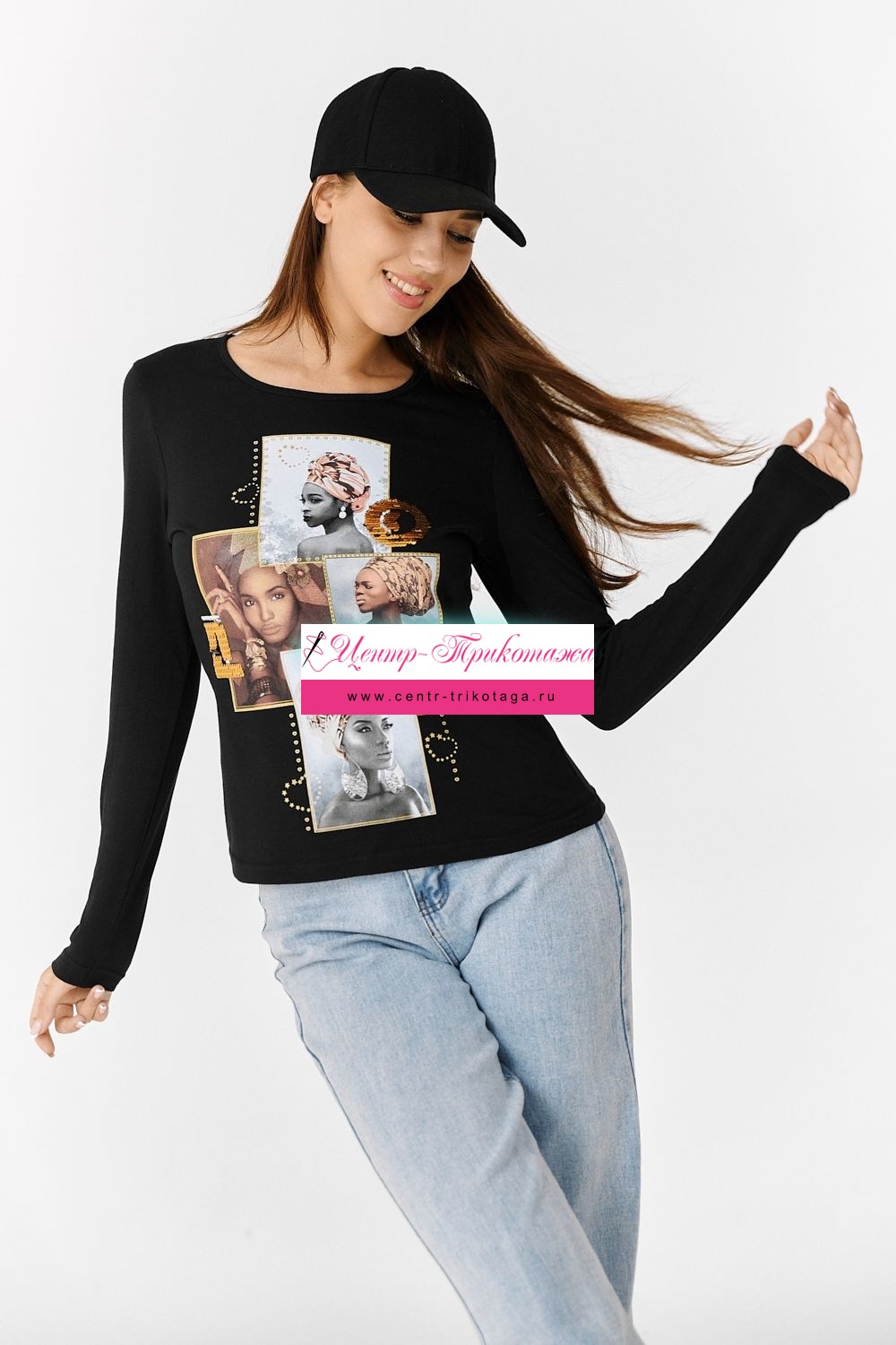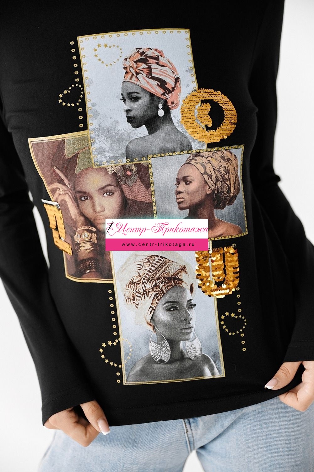 Туника полуприлегающего силуэта, с округлой горловиной, длиной до середины бедра. Рукав втачной, длинный. Горловина обработана бейкой из основного полотна. На полочке красивая печать, декорированная золотыми пайетками