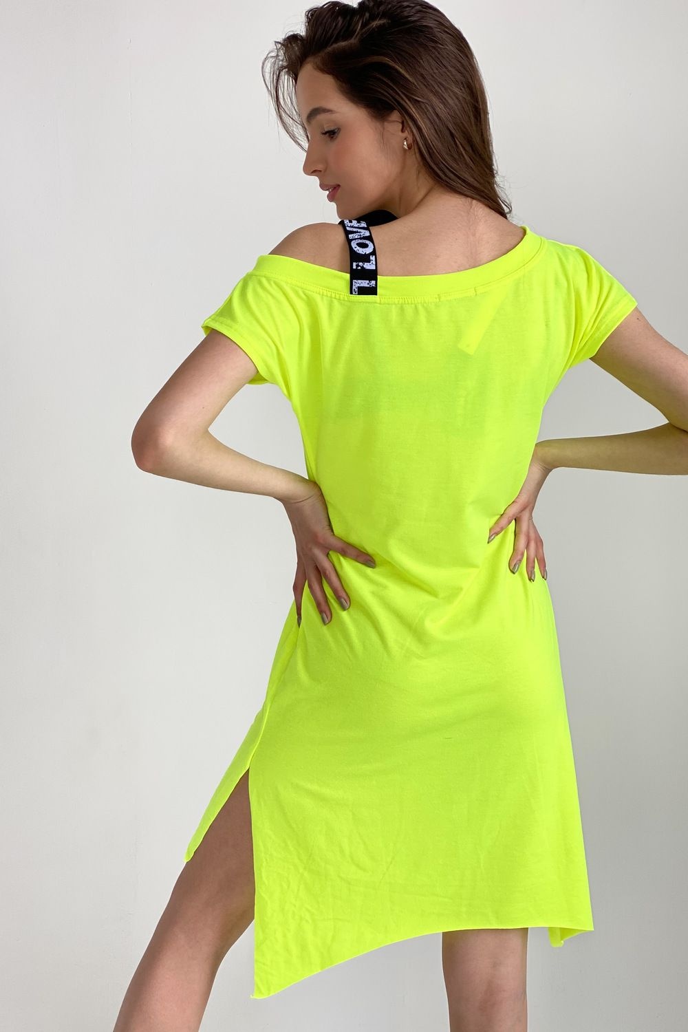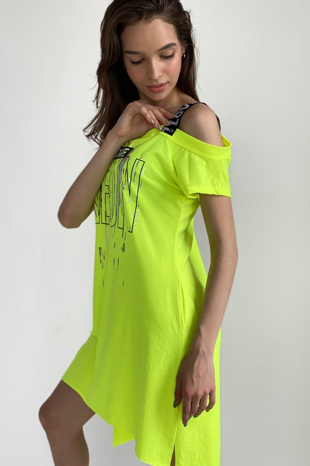 Туника полуприлегающего силуэта, длиной выше колена спереди и удлиненной спинкой сзади, с фигурной линией низа. Рукав цельнокроеный, короткий. В нижней части боковых швов обработаны разрезы. Горловина асимметричная с эластичной бретелью, обработана обтачкой из основного полотна.