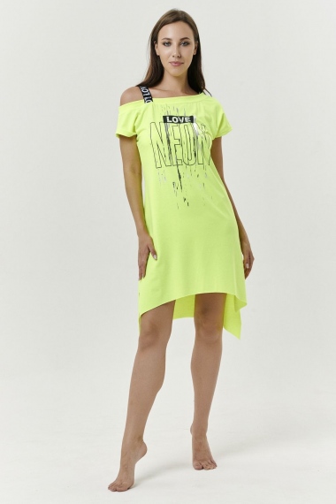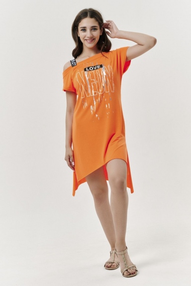 Туника полуприлегающего силуэта, длиной выше колена спереди и удлиненной спинкой сзади, с фигурной линией низа. Рукав цельнокроеный, короткий. В нижней части боковых швов обработаны разрезы. Горловина асимметричная с эластичной бретелью, обработана обтачкой из основного полотна.