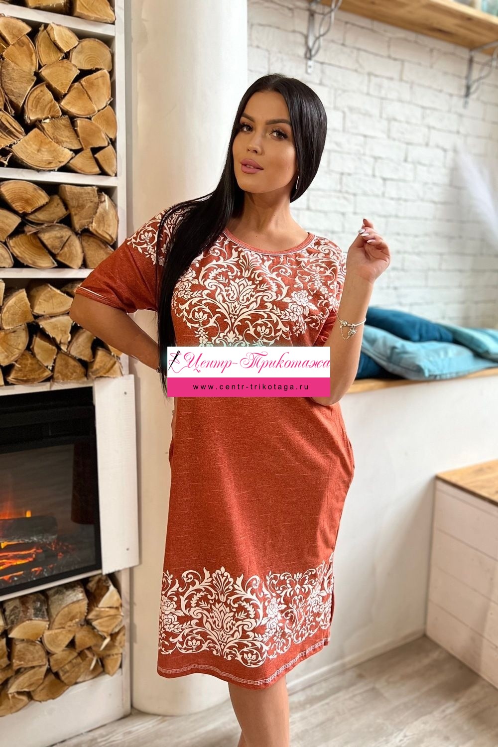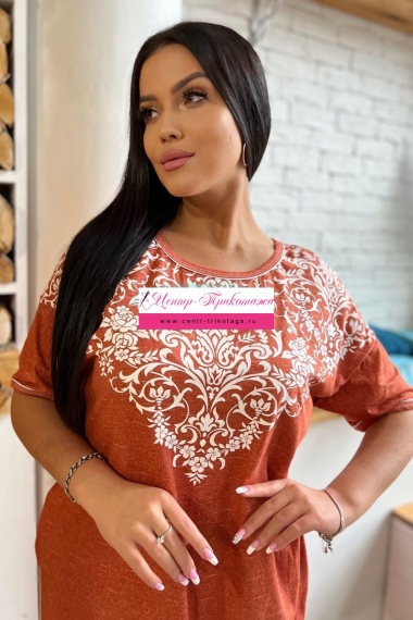 Туника прямого силуэта, с округлой горловиной, с разрезами в нижней части боковых швов. Горловина и низ рукавов обработаны бейкой из основного полотна.