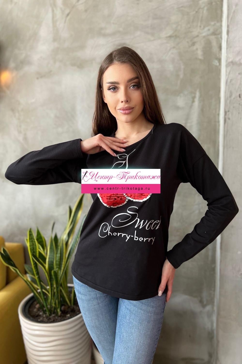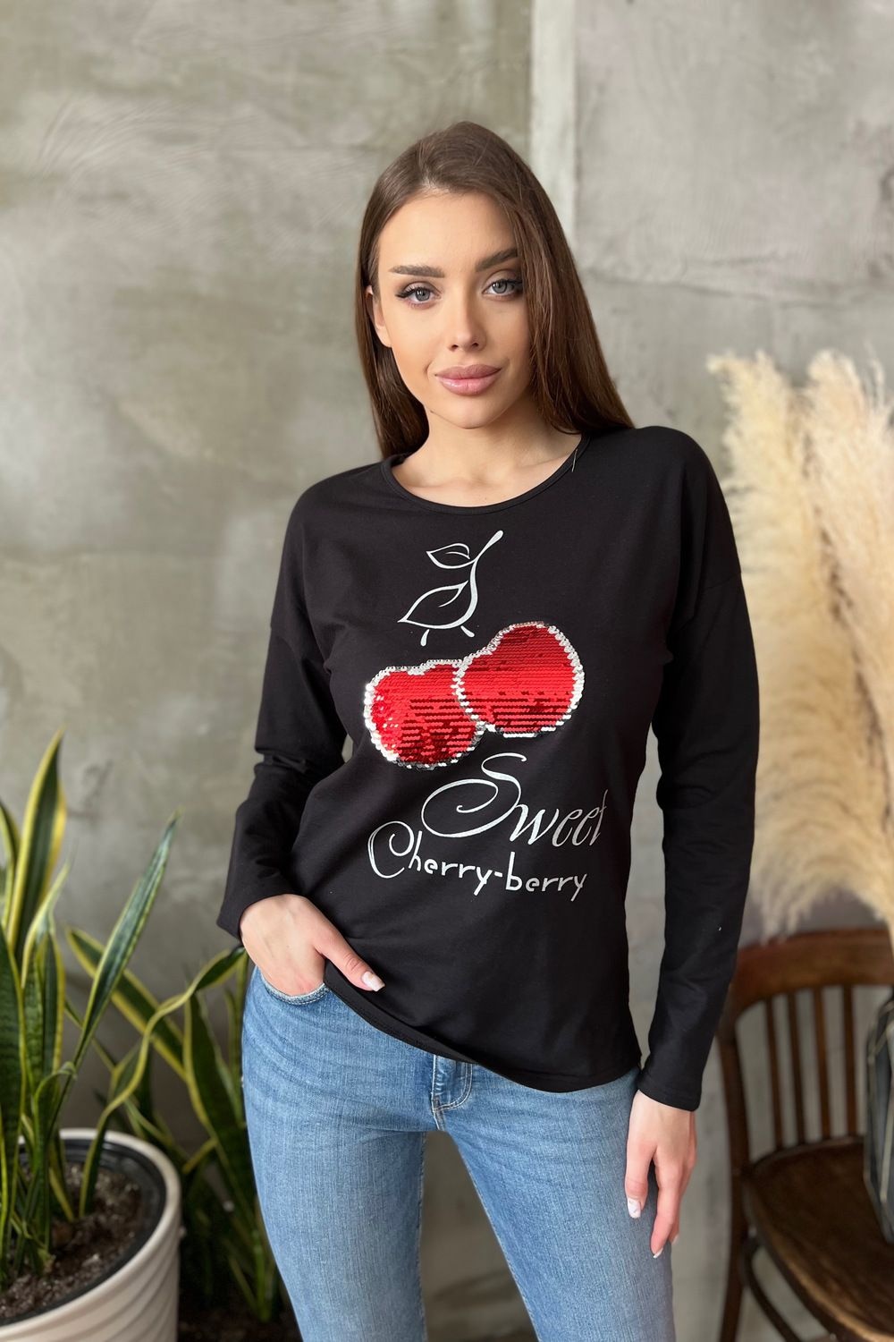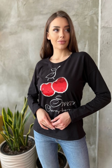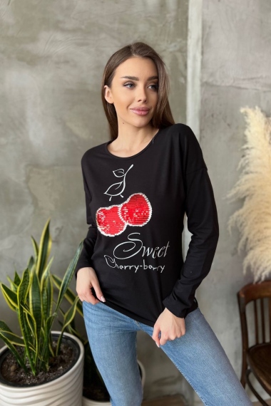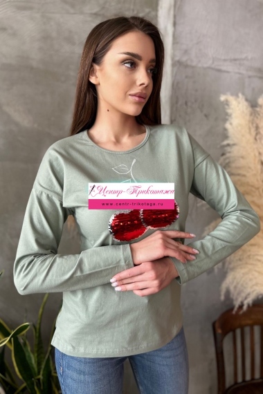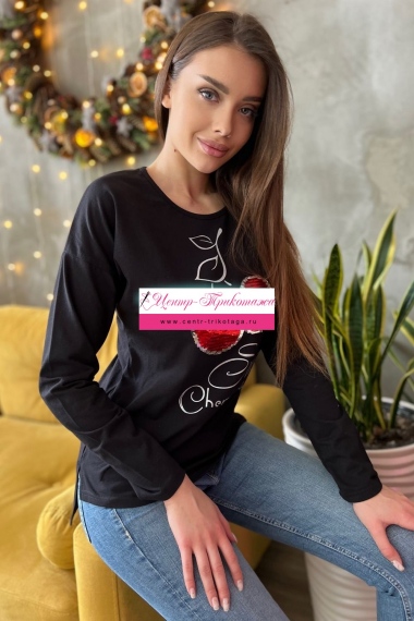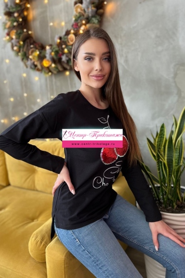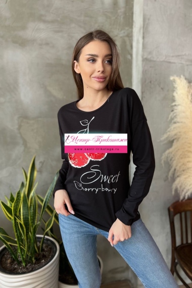 Туника полуприталенного силуэта, с удлиненной спинкой, с округлой горловиной. Рукав длинный. В нижней части боковых швов обработаны разрезы. Горловина обработана бейкой из основного полотна. На полочке эффектная аппликация из пайеток и печать