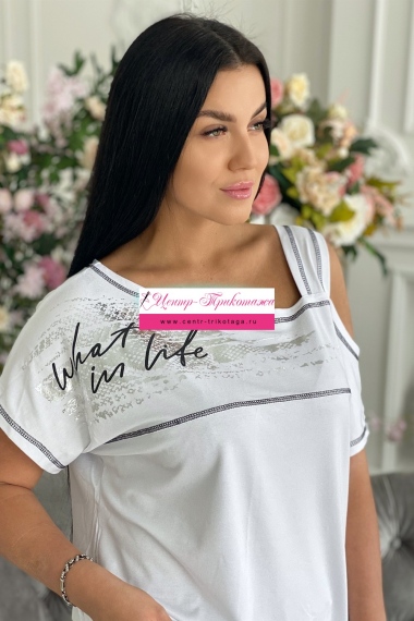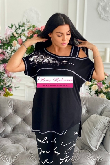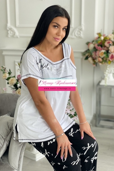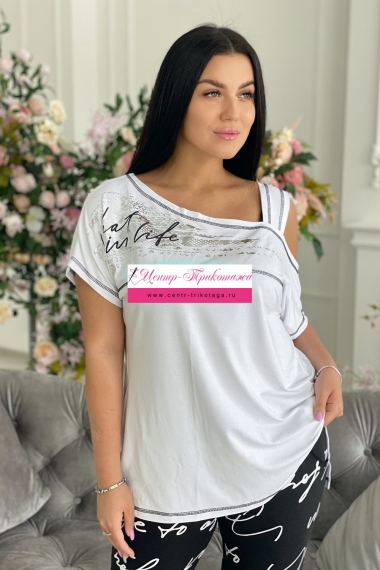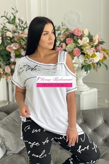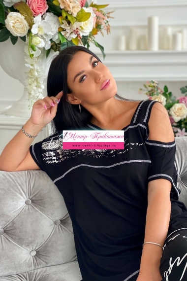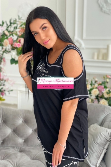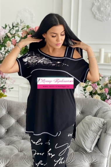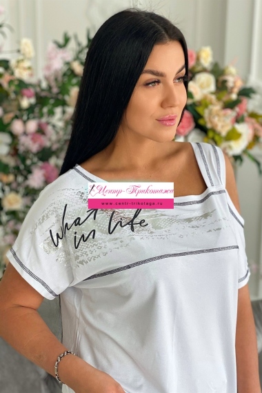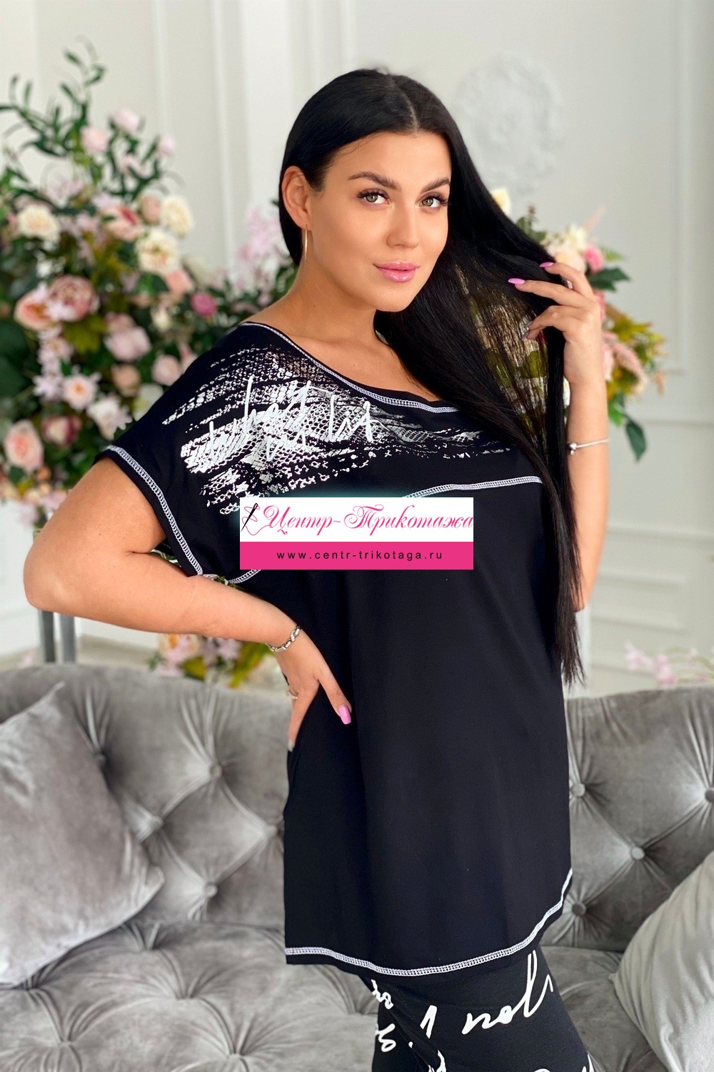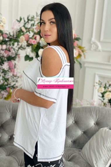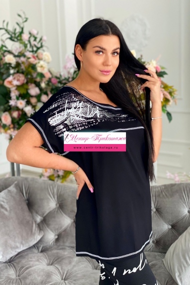 Туника женская полуприлегающего силуэта. Рукав цельнокроенный короткий, с одной стороны бретель на плече, в боковых швах разрезы. В верхней части полочки модный принт.