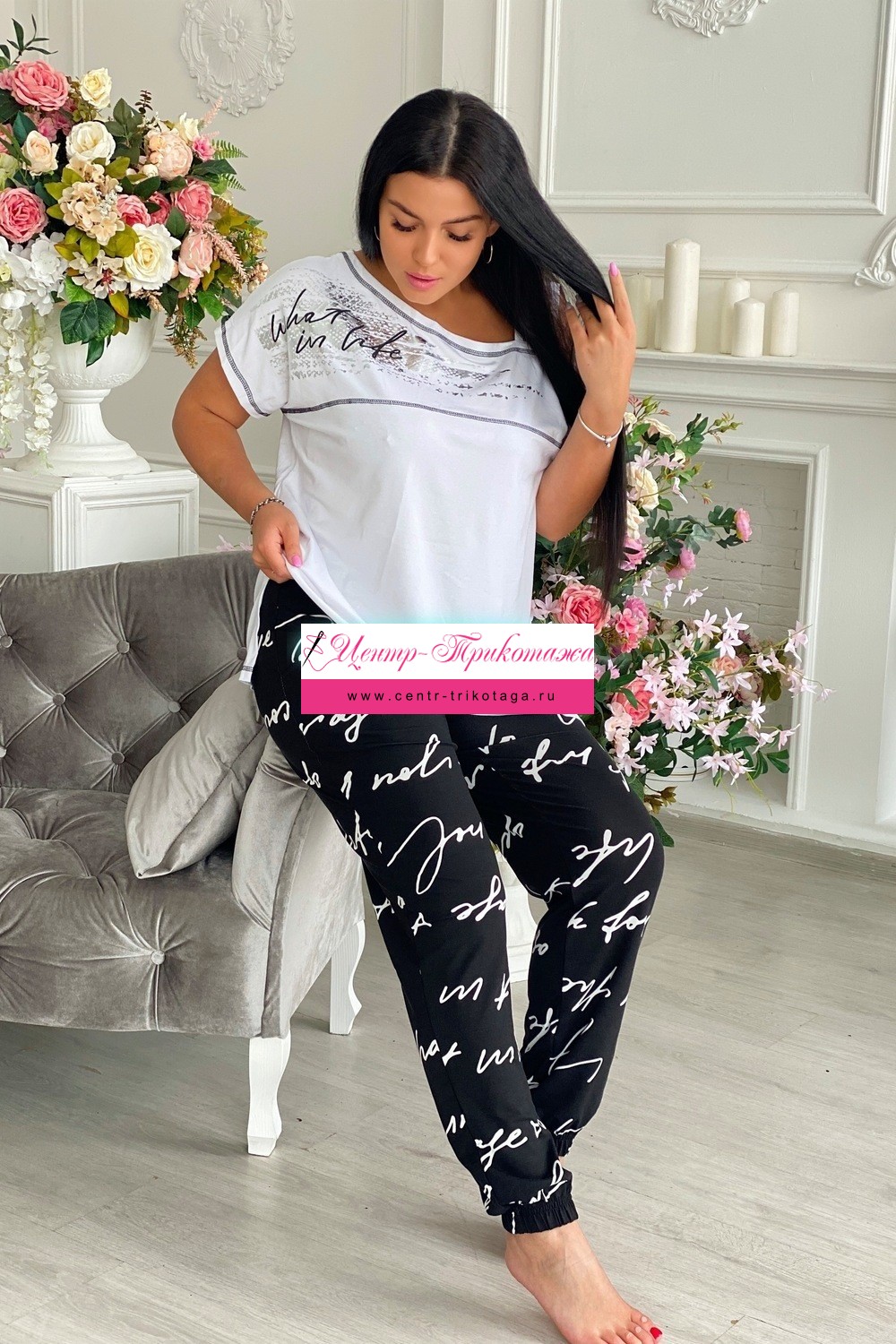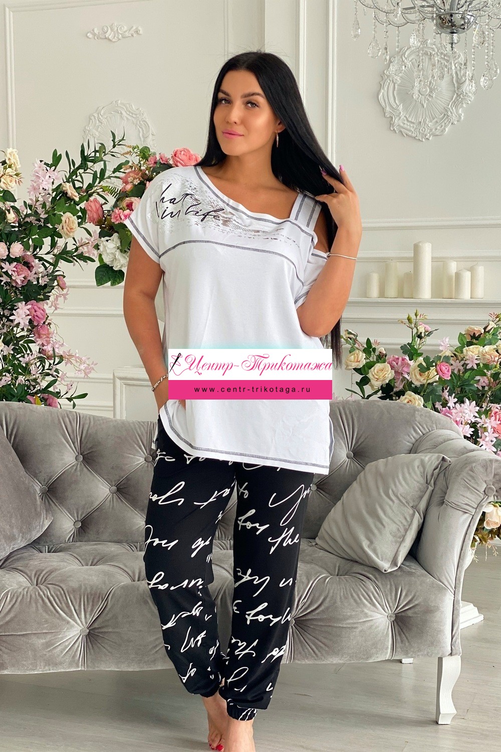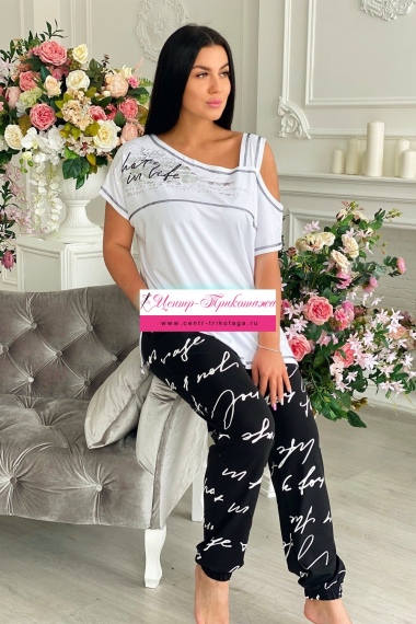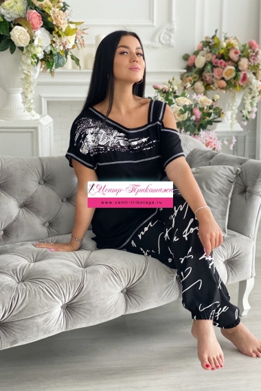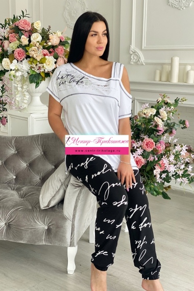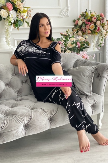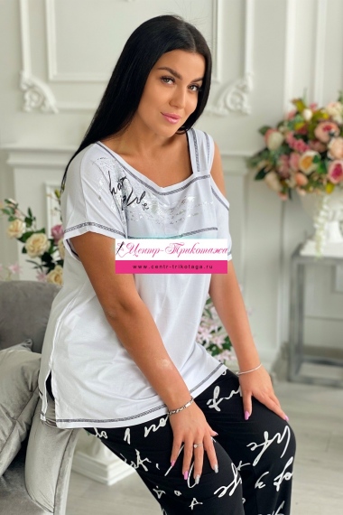 Туника женская полуприлегающего силуэта. Рукав цельнокроенный короткий, с одной стороны бретель на плече, в боковых швах разрезы. В верхней части полочки модный принт.