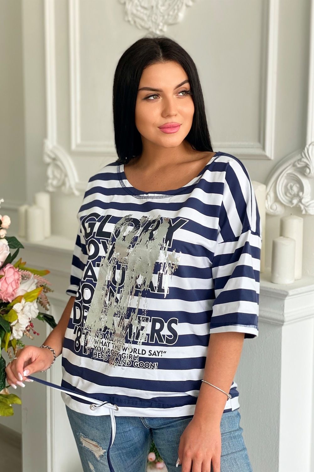 Туника женская прямого силуэта. Рукав цельнокроенный со швом. Горловина круглая. Низ туники фиксируется завязками. На полочке принт.