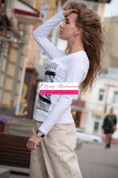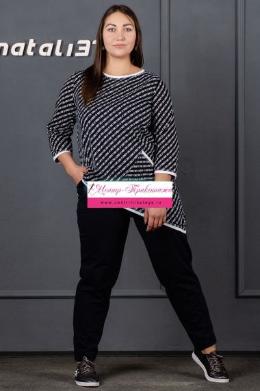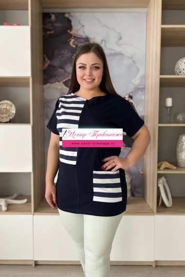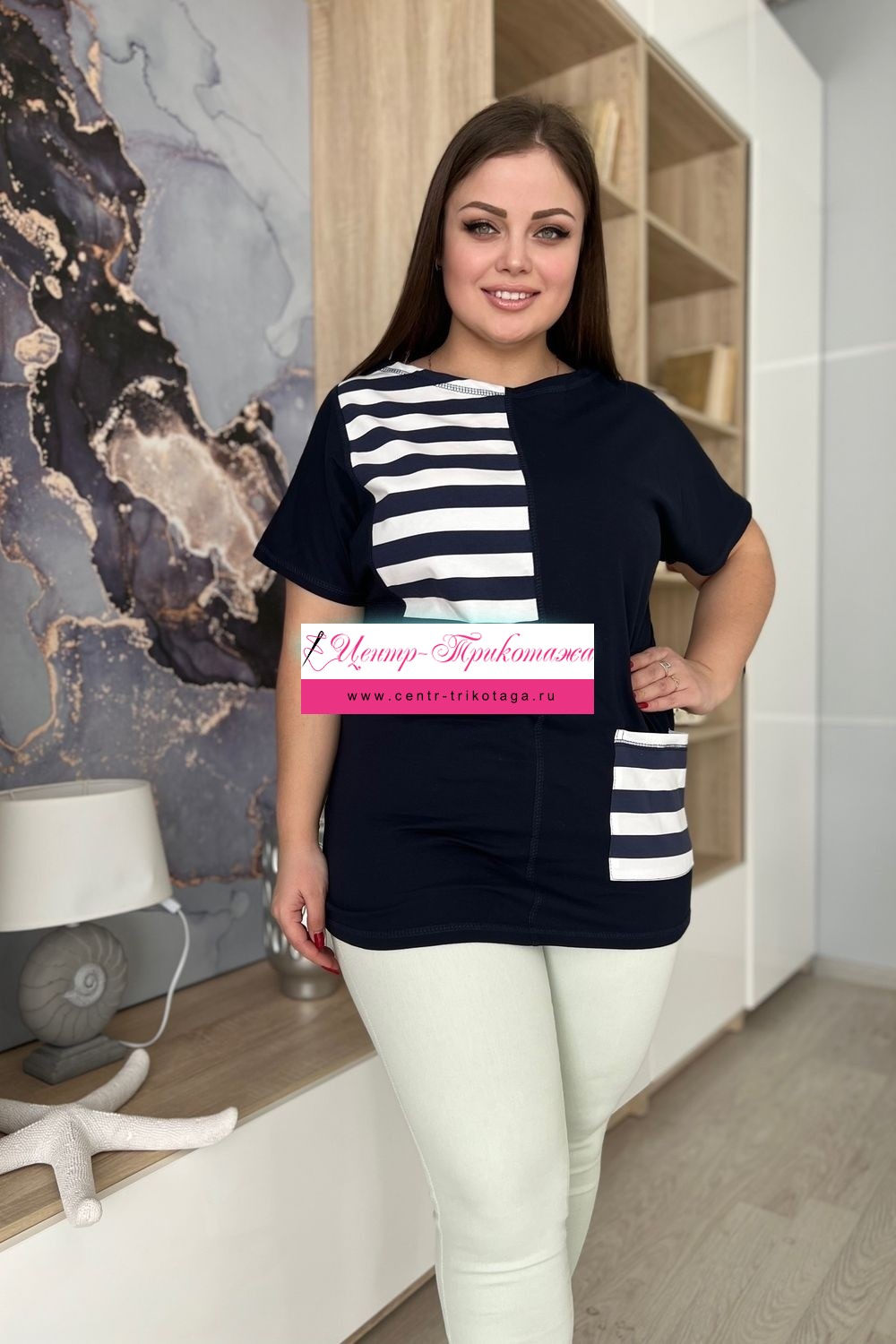 Туника женская прямого силуэта с цельнокроенным коротким рукавом. На полочке вставка и накладной карман из ткани в полоску. На модели 52 размер