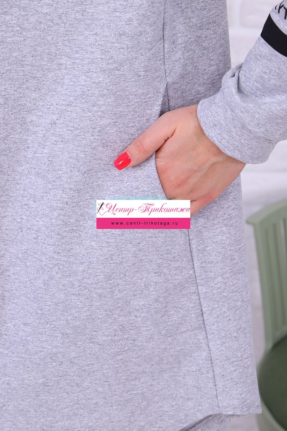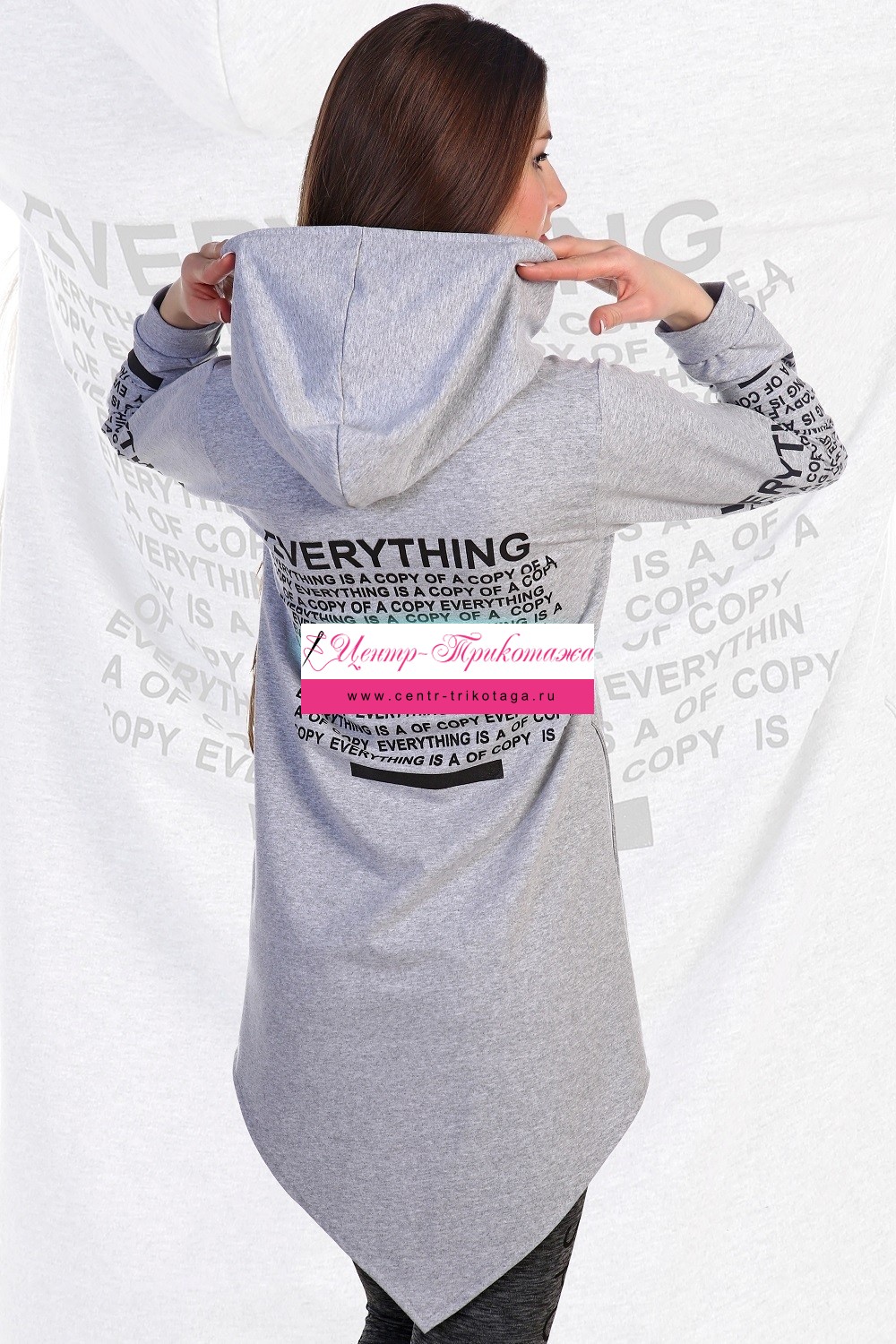 Туника необычного кроя из футера с лайкрой. Длинные рукава, общая длина до коленей спереди, более коротко по бокам. На молнии, с капюшоном. Дизайн в виде принтов с надписями