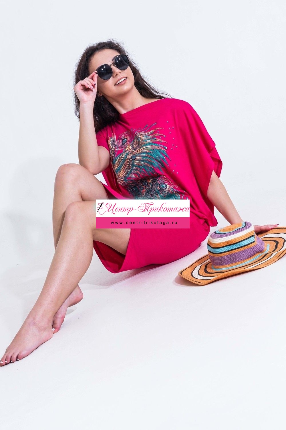 Туника из вискозы с широкими рукавами. Принт в виде сказочной птицы с орнаментами, общая длина до середины бедра, рукав короткий. Пять расцветок — бирюзовая, малиновая, ментоловая, фуксия и шоколадная