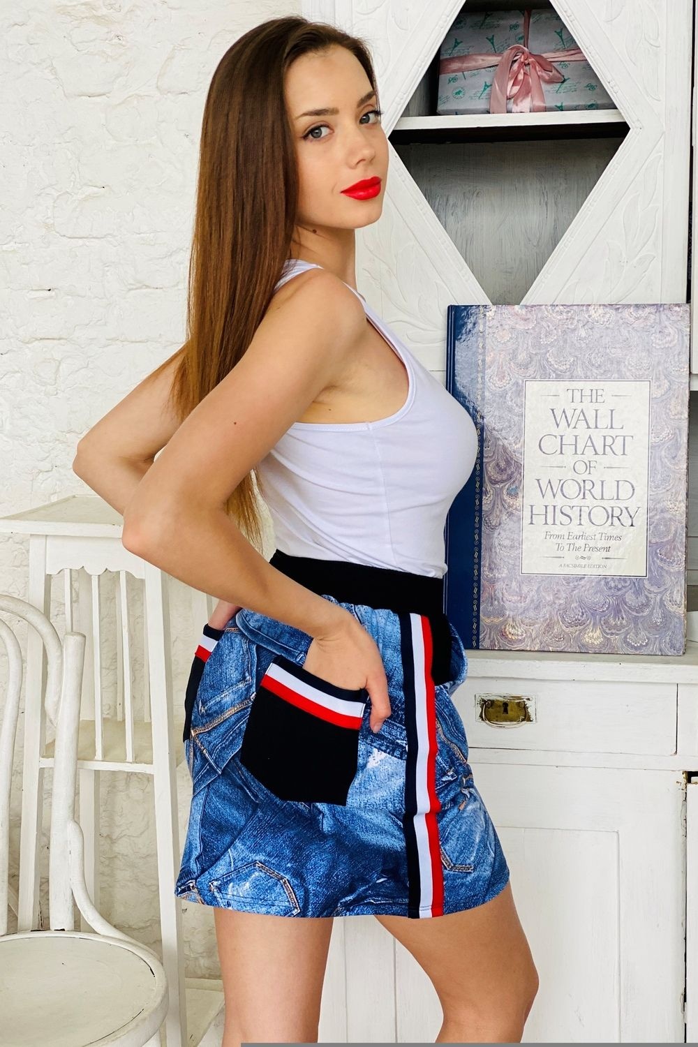 Юбка в спортивном стиле, полуприлегающего силуэта, длиной выше колена, с боковыми карманами, на эластичном поясе. Сзади расположены карманы из отделочного полотна, обработанные отделочной тесьмой. Вдоль боковых швов расположены лампасами из отделочной тесьмы.
