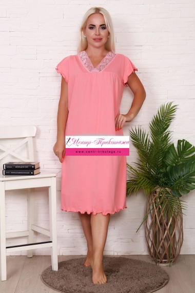 Сорочка женская полуприлегающего силуэта. Длинна чуть выше колена, плечо спущенное без рукава. Горловина круглой формы, обработана окантовкой. На полочке располагаются две небольшие кокетки в районе плеча с кружевом. Принт (шелкография) располагается по низу изделия с правой стороны.