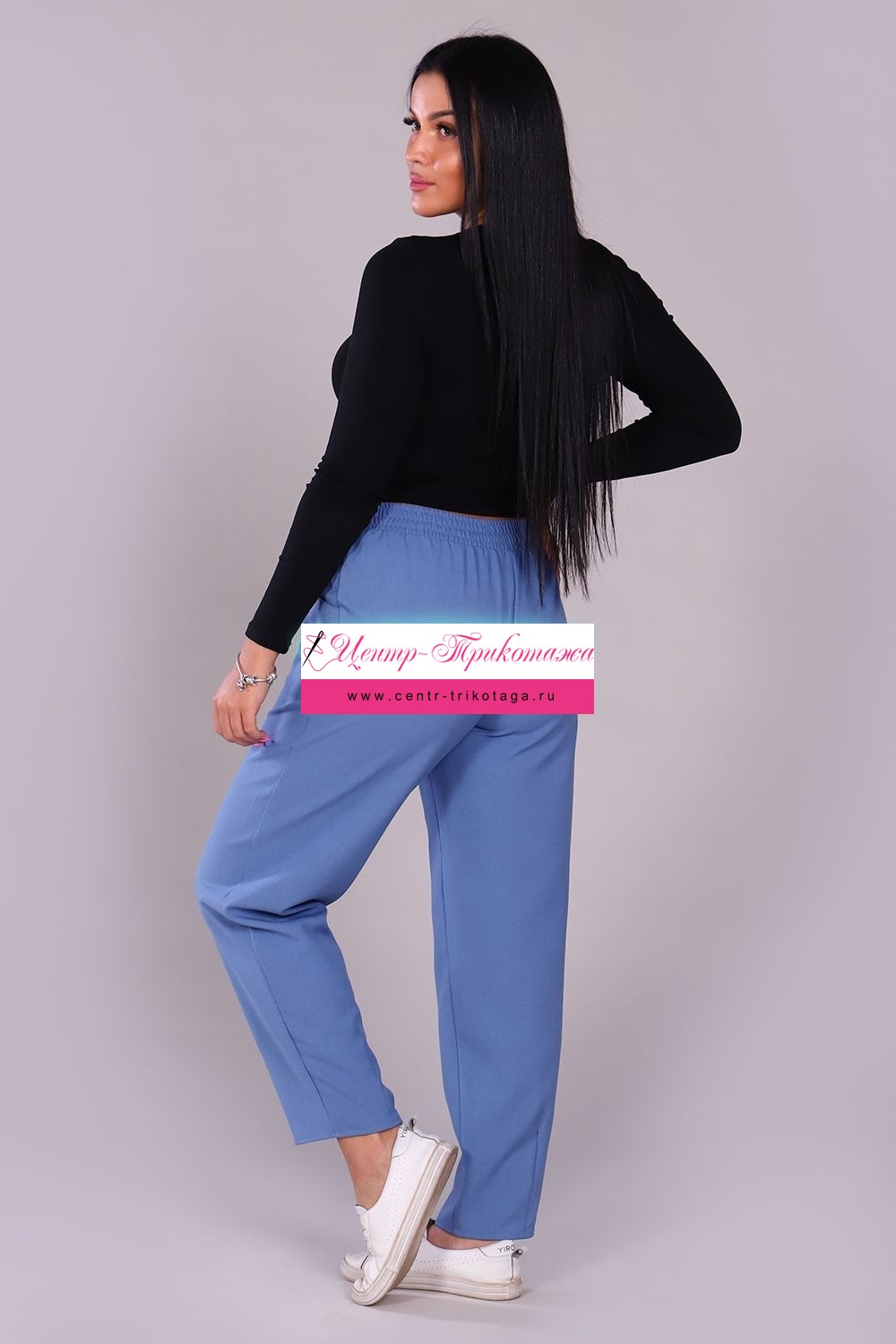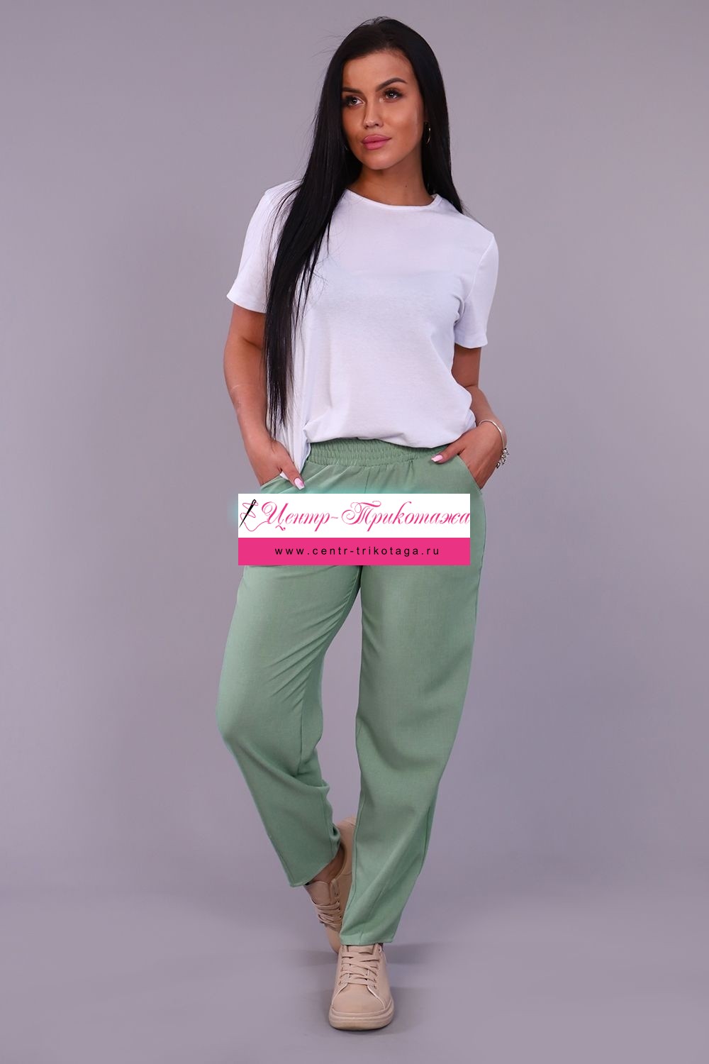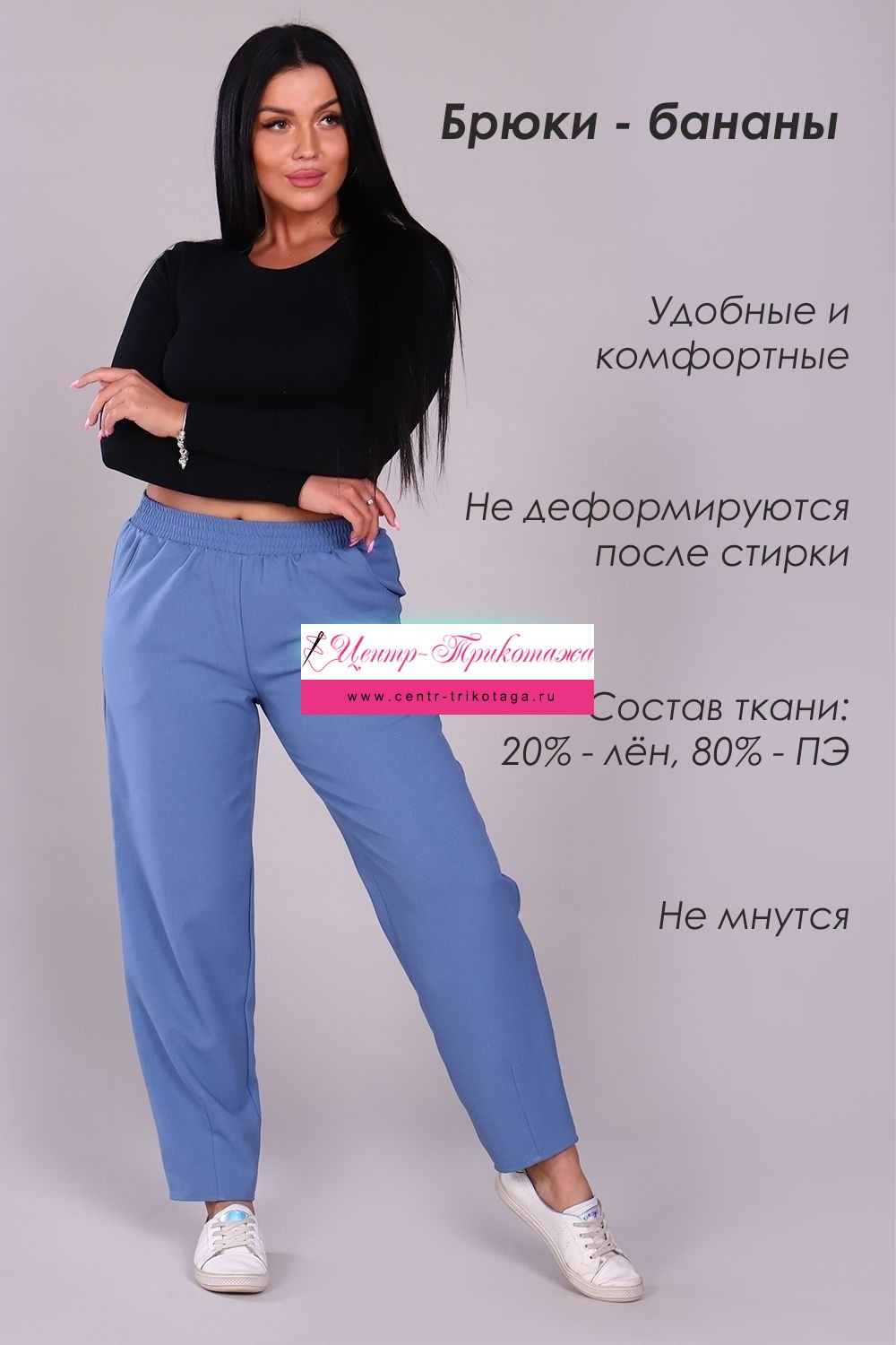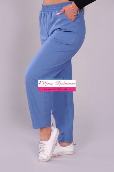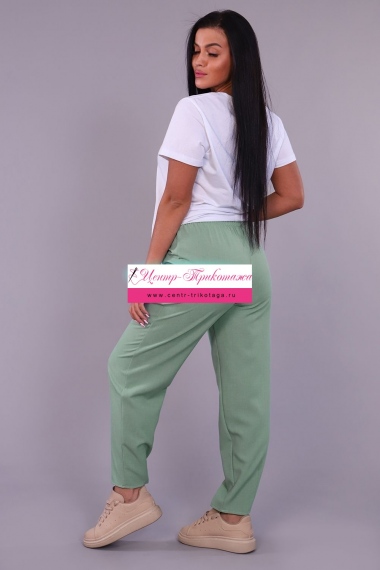 Модные женские брюки-бананы из смесовой ткани с содержанием льна. Свободные, зауженные к низу с помощью вытачек, широкий пояс на резинке, по бокам внутренние карманы. Длина брюк до щиколотки (рост модели 165 см). Очень комфортны и удобны в носке, не мнутся, отлично смотрятся со спортивной обувью.