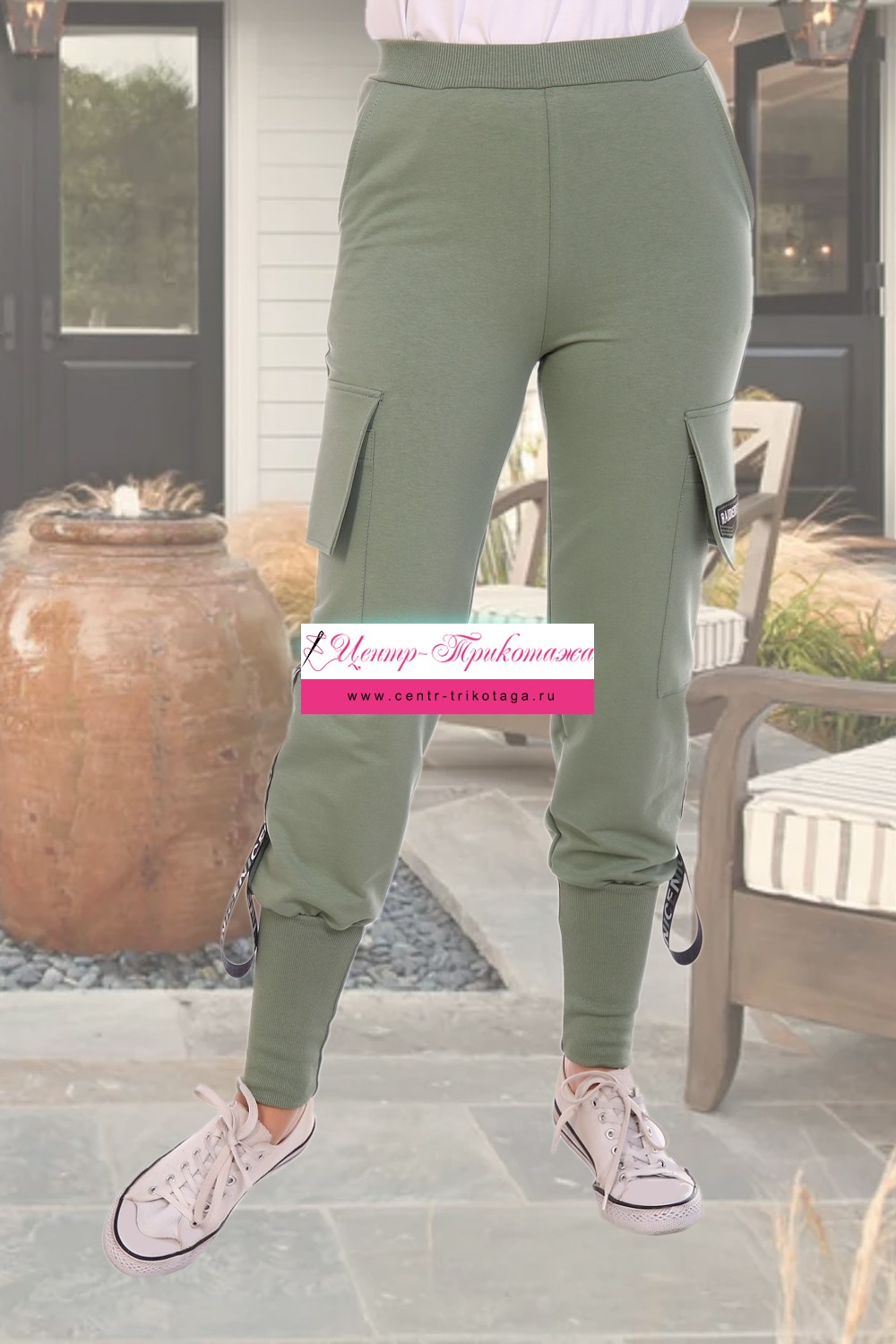 Спортивные брюки, полуприлегающего силуэта на эластичном поясе,низ брюк на широких притачных манжетах. по боковым швам расположенны накладные карманы и декоративная лента.