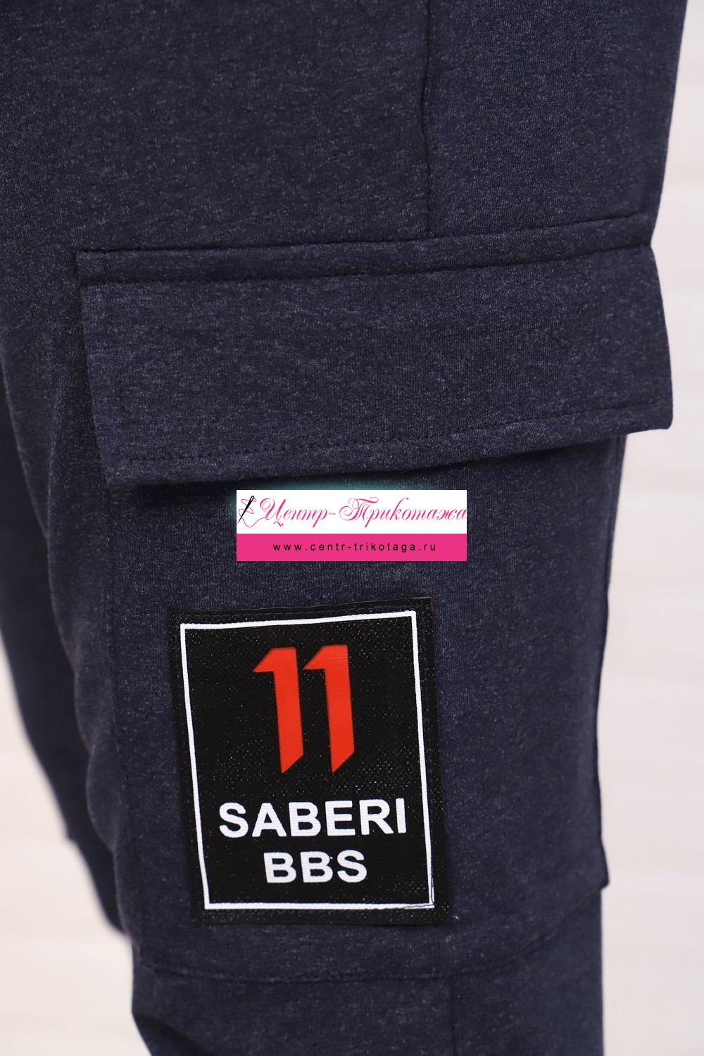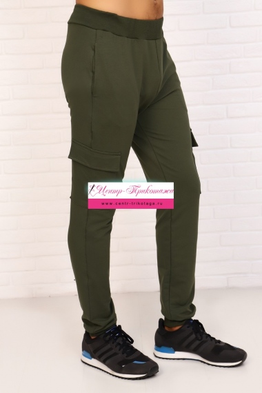 Спортивные мужские брюки на манжетах, пояс эластичный, карман в боковом шве, и накладной карман на уровне колена.