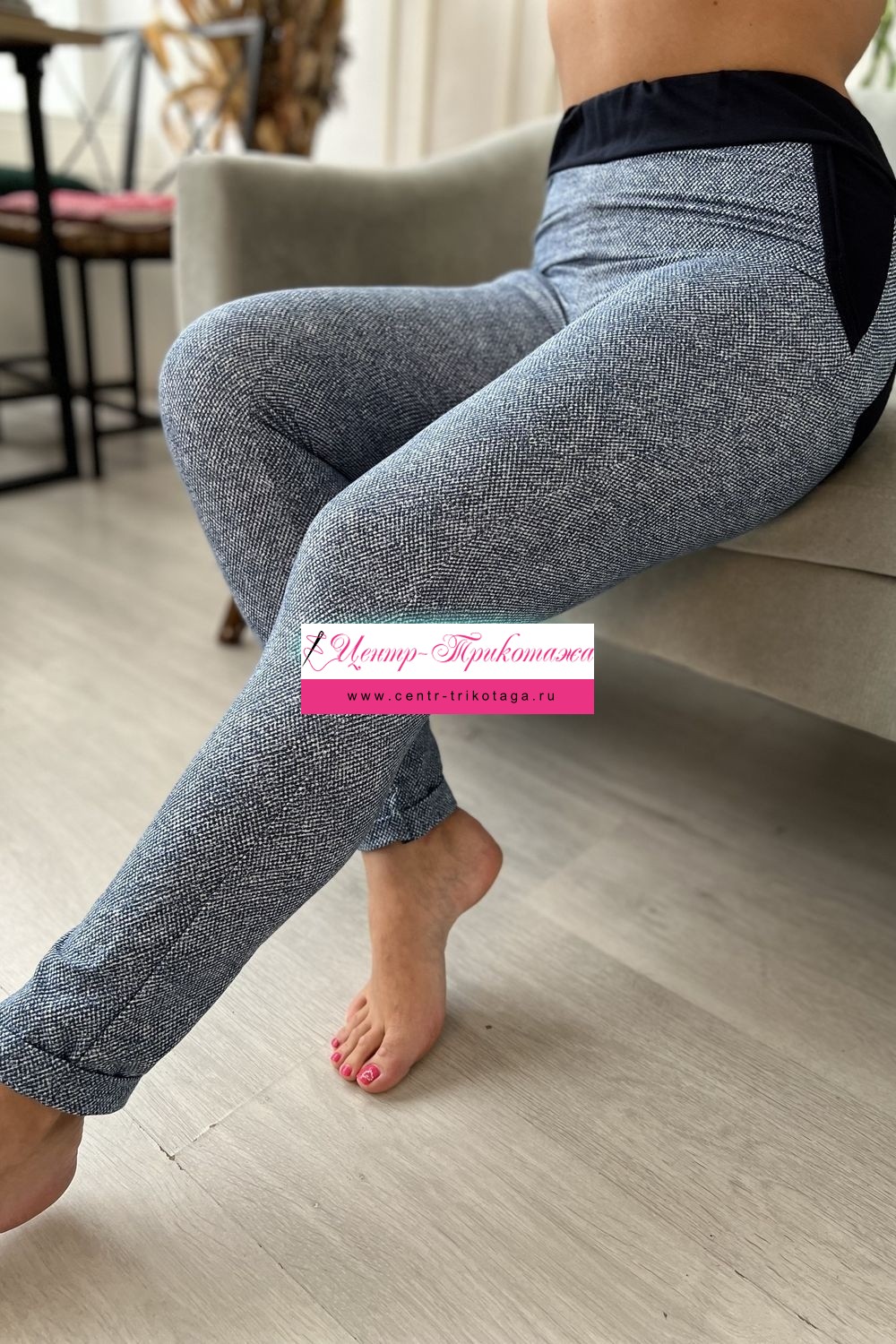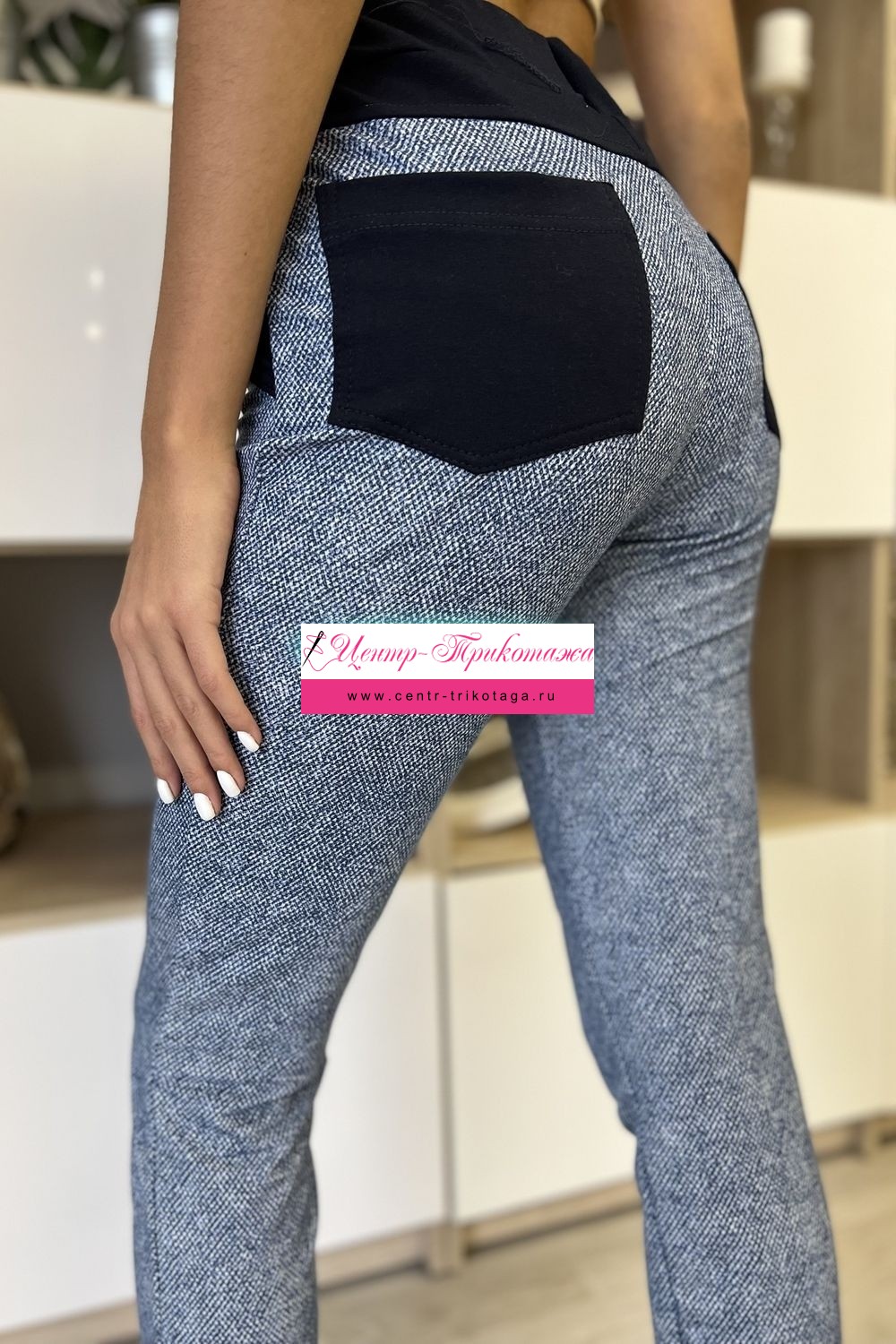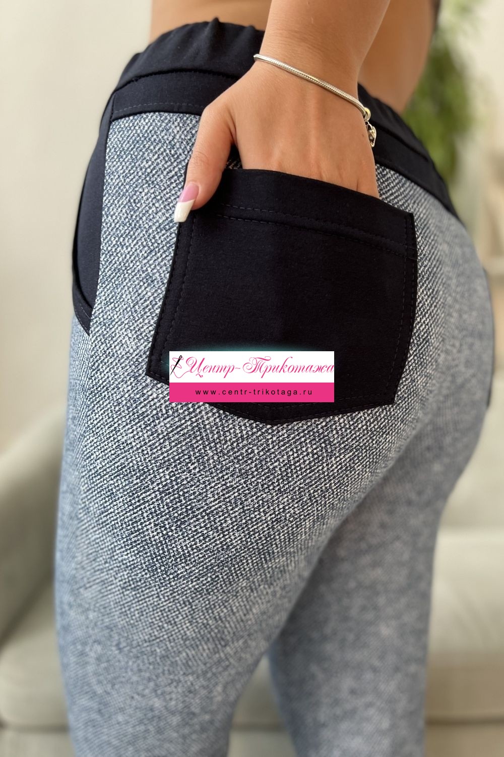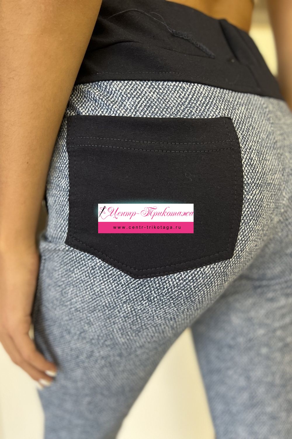 Брюки прилегающие, длина 7/8, внизу цельнокроенная манжета. Пояс, бочки, задние накладные карманы и кокетка из отделочной ткани.
