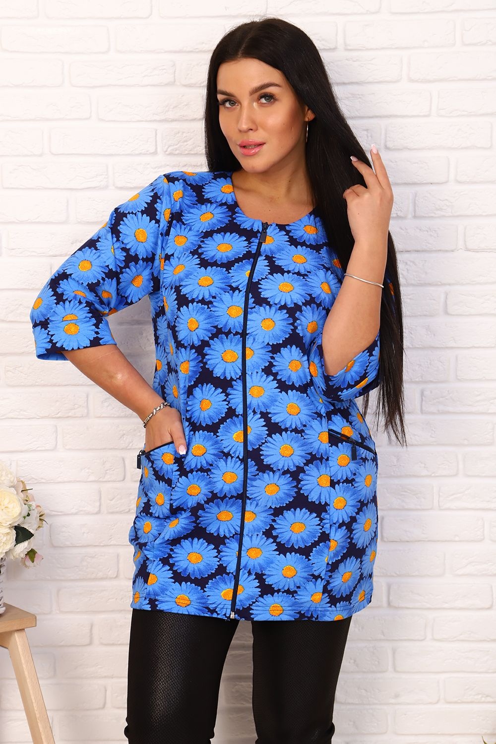 Элегантный френч, можно носить как с юбкой, так и с брюками или джинсами. Круглая горловина, на молнии, с рельефами и карманами, рукав 3/4, длина ниже бедра. Цвета в ассортименте, без подбора