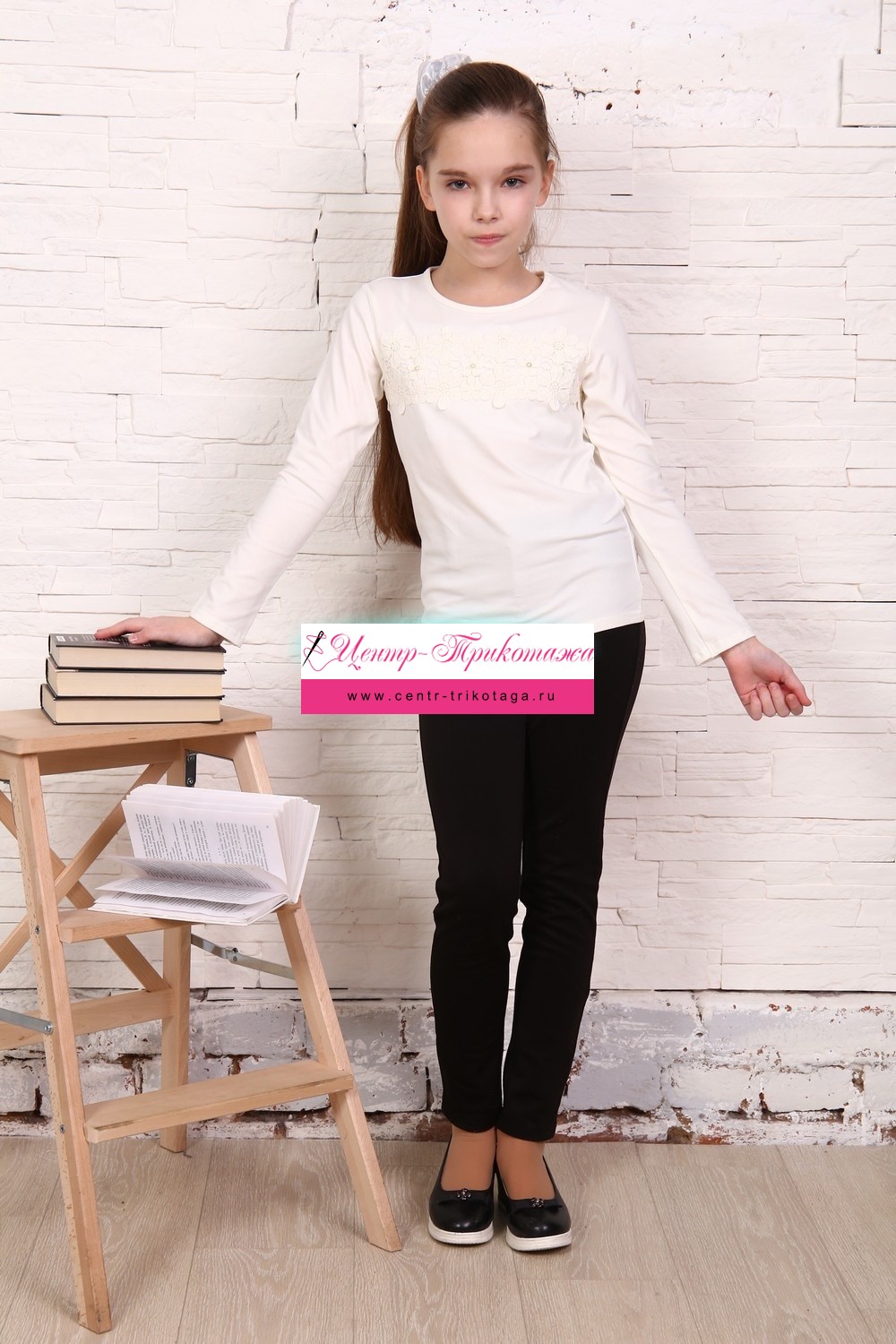 Блузка для девочек дошкольного, младшего и старшего школьного возраста, из однотонного трикотажного полотна кулирка с лайкрой. Блузка прямого силуэта, с втачным рукавом, без застежки. Спереди и на спинке отсутствуют линии членения. На передней части джемпера настрочено кружево по линии груди. Срез горловины обработан узкой окантовочной лентой из того же полотна в 4 сложения. Рукав одношовный, длинный. Низ рукава без манжеты, подогнут. На кружево приклеены 3 полубусины.