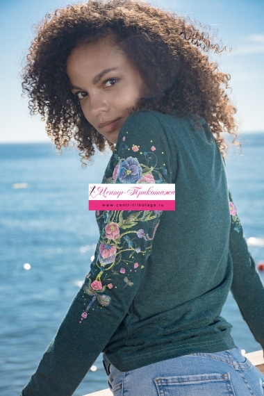 Универсальная модель из очень мягкой, комфортной к телу ткани. Прекрасно комбинируется с лосинами, джинсами, юбками, брюками. Полочка и рукава оформлены красивым цветочным принтом со стрекозами с добавлением золотого глиттера. Ткань очень хорошо тянется.