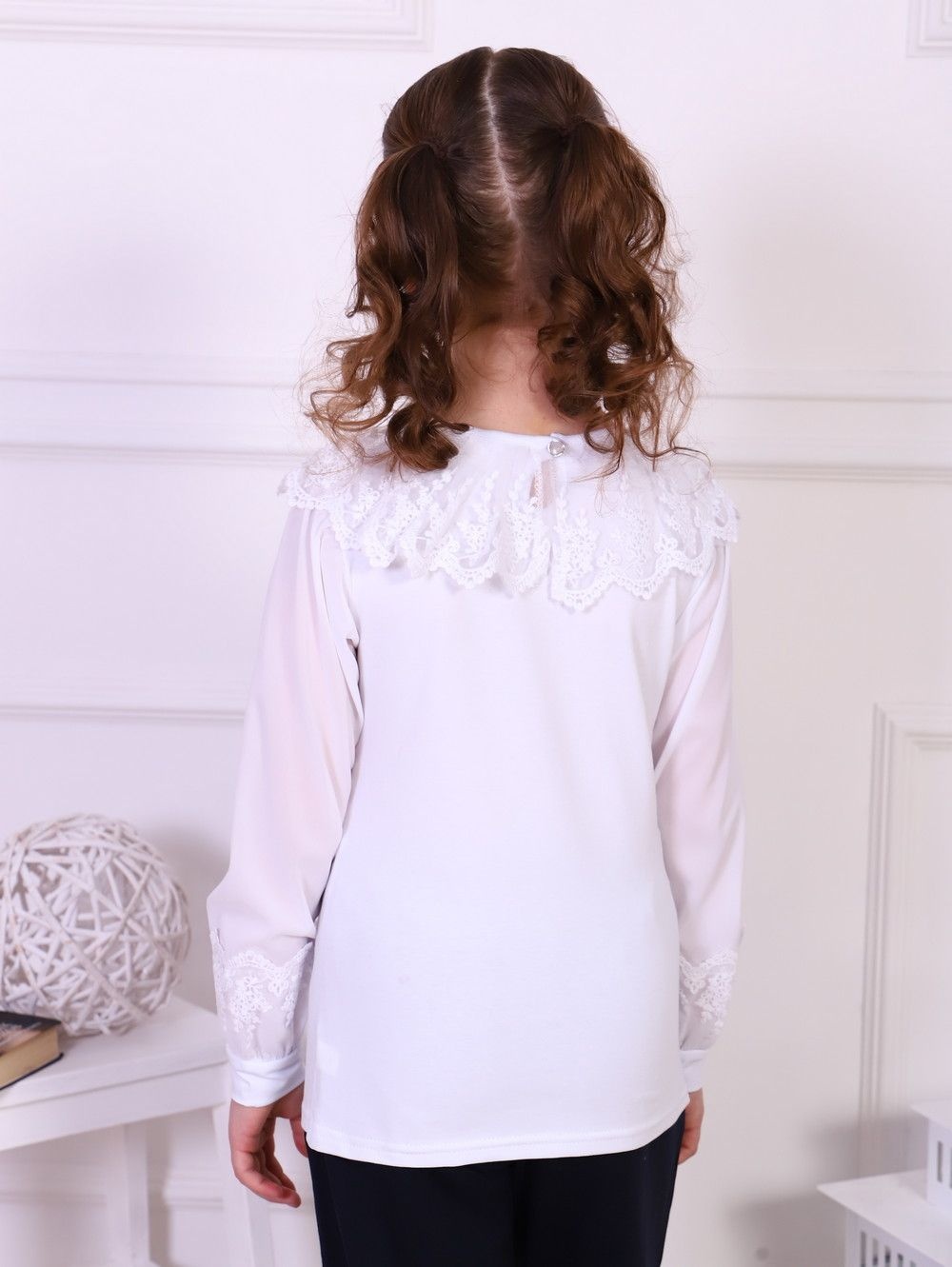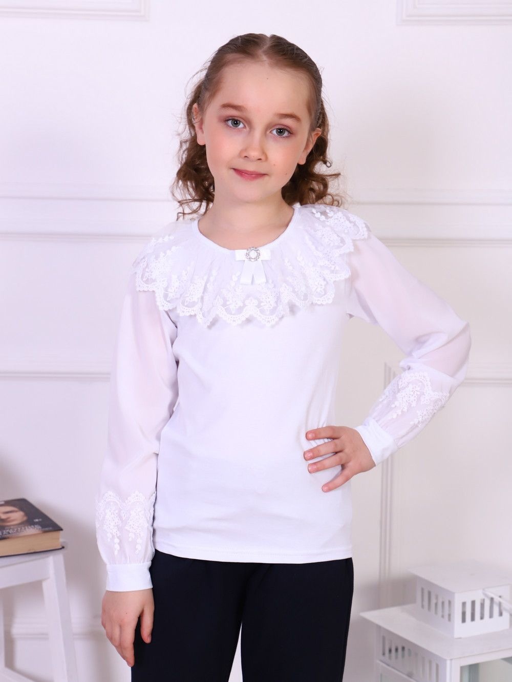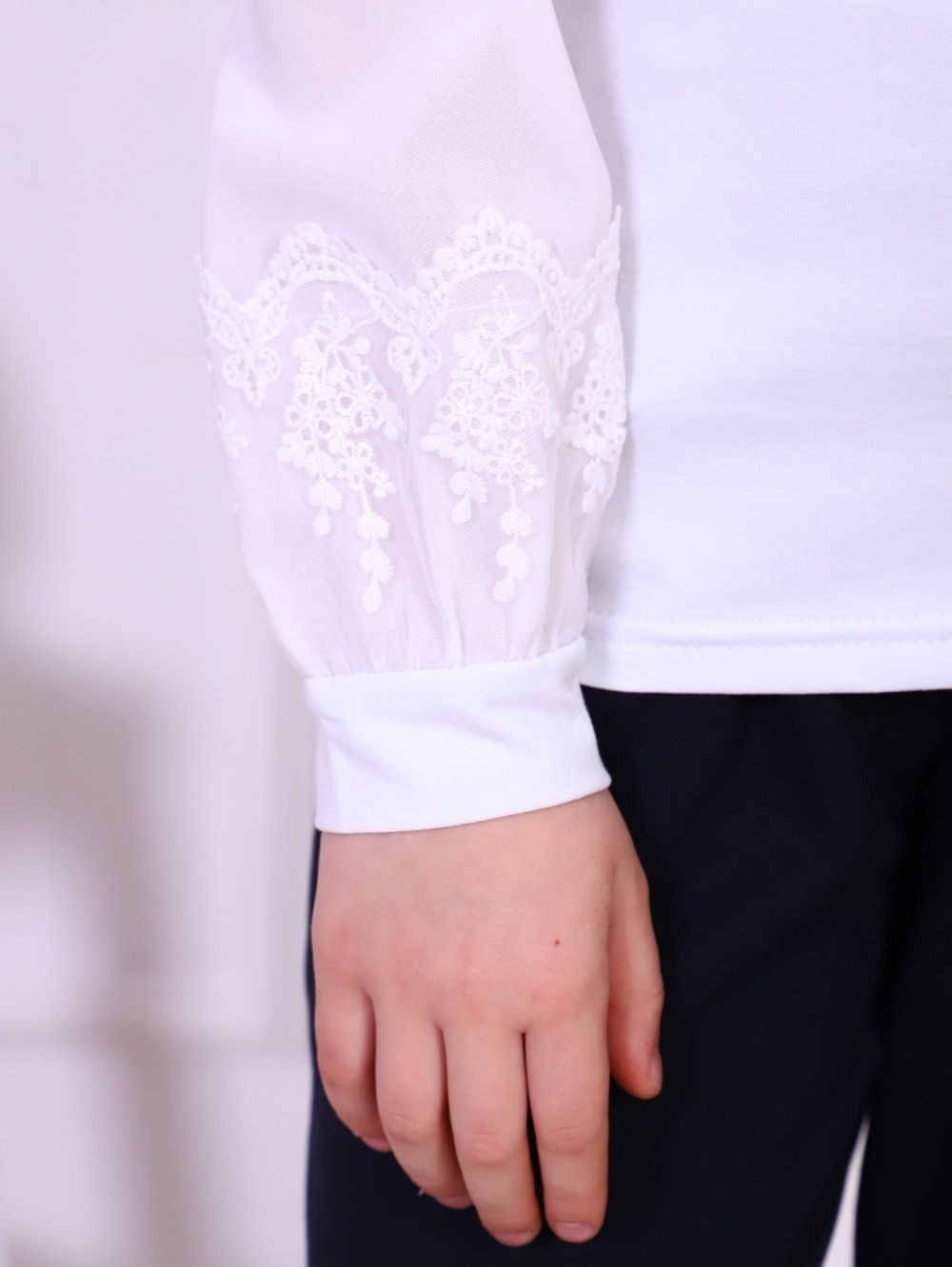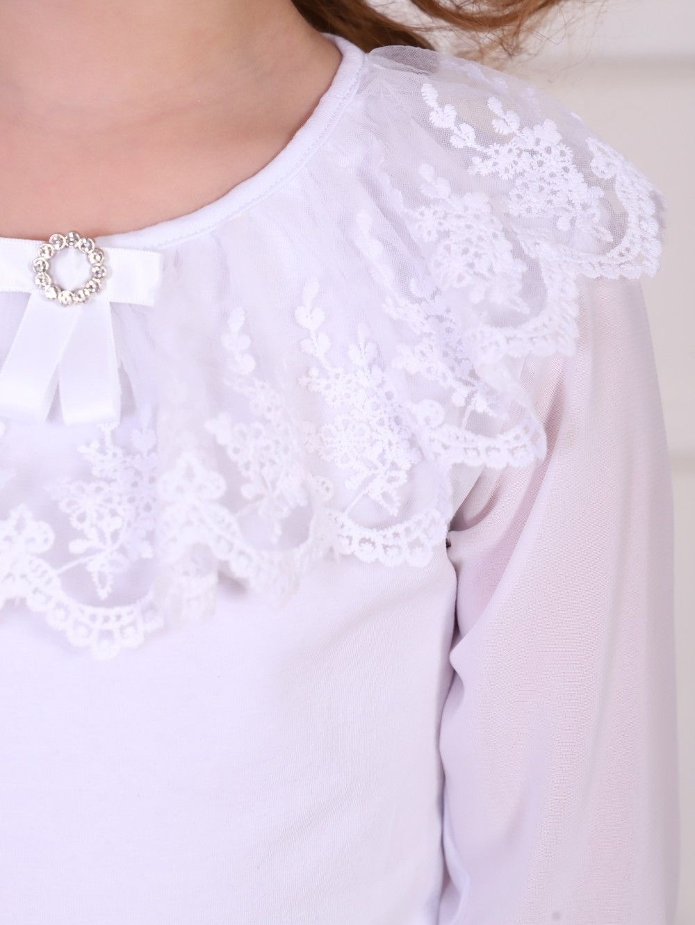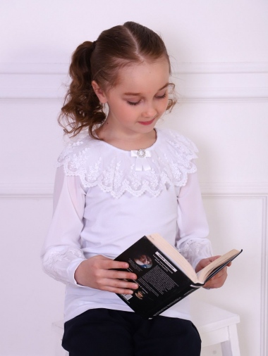 Блузка для девочек с длинным рукавом. Данная модель станет основой школьного или праздничного образа. Элегантное мягкое кружево на горловине можно красиво разложить на сарафан или пиджак, что создаст нарядный look. Оригинальная модель добавит романтизма в образ и подчеркнет индивидуальность, можно сочетать с юбкой, сарафаном и брюками. Шифоновые рукава на манжете, по низу настрочено кружево. На спинке вырез в виде капли с застежкой на петлю и пуговицу. Блузка сшита из качественного трикотажа - кулирка с лайкрой, используемый материал не теряет форму после многократных стирок, мягкий и приятный к телу, устойчив к износу. Для сохранения первоначальных свойств изделия, важно соблюдать рекомендации по уходу.
