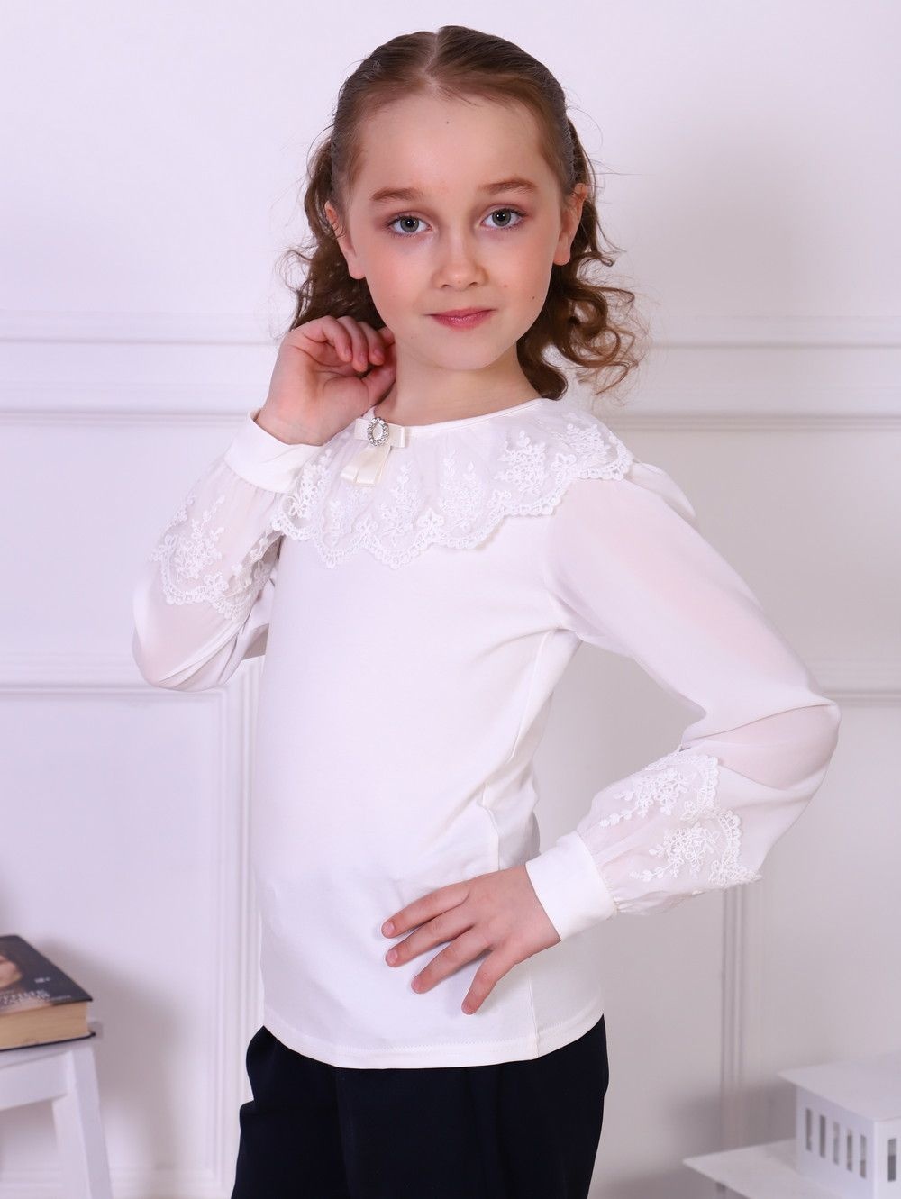 Блузка для девочек с длинным рукавом. Данная модель станет основой школьного или праздничного образа. Элегантное мягкое кружево на горловине можно красиво разложить на сарафан или пиджак, что создаст нарядный look. Оригинальная модель добавит романтизма в образ и подчеркнет индивидуальность, можно сочетать с юбкой, сарафаном и брюками. Шифоновые рукава на манжете, по низу настрочено кружево. На спинке вырез в виде капли с застежкой на петлю и пуговицу. Блузка сшита из качественного трикотажа - кулирка с лайкрой, используемый материал не теряет форму после многократных стирок, мягкий и приятный к телу, устойчив к износу. Для сохранения первоначальных свойств изделия, важно соблюдать рекомендации по уходу.