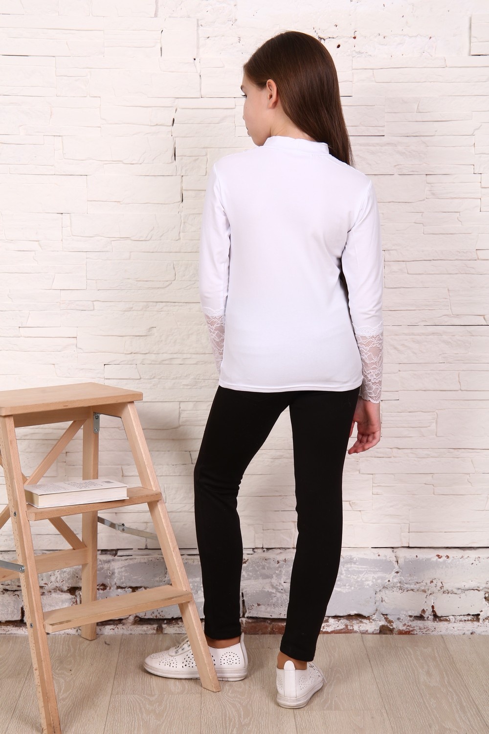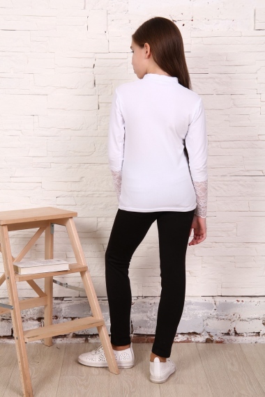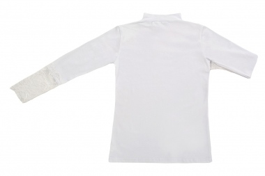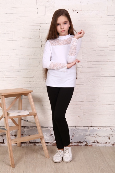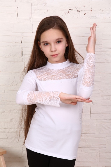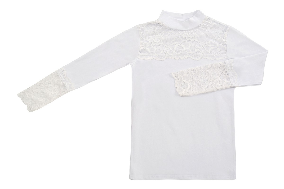 Блузка для девочек младшего и старшего школьного возраста, из трикотажного полотна – однотонная кулирка с лайкрой и кружева (дизайн и ширина кружева может меняться). Блузка прилегающего силуэта, с втачным рукавом, с воротником – стойкой. Спереди отрезная кокетка из кружева. На спинке отсутствуют линии членения. Рукав длинный одношовный. По низу рукава настрочено широкое кружево. Низ изделия подогнут.