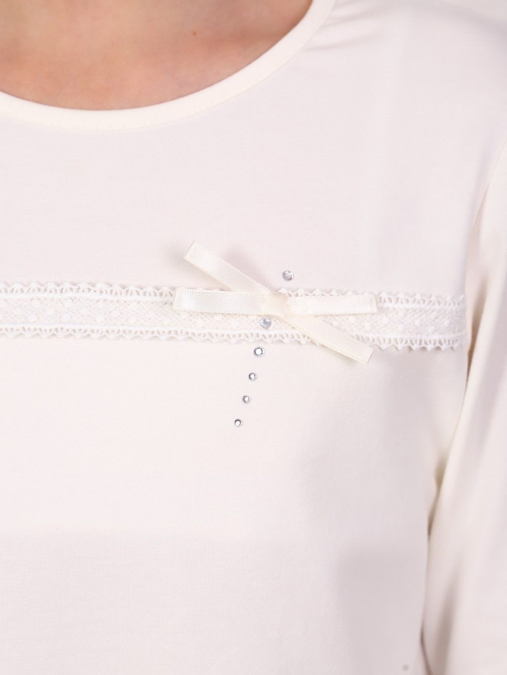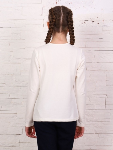 Блузка для девочек младшего и старшего школьного возраста, из однотонного трикотажного полотна. Блузка прилегающего силуэта, с втачным рукавом. Спереди и на спинке отсутствуют линии членения. Рукава длинные. Низа рукавов и изделия подогнуты. Горловина окантована. Спереди по линии груди настрочено кружево и прикреплен декоративный элемент из страз и атласной ленты.