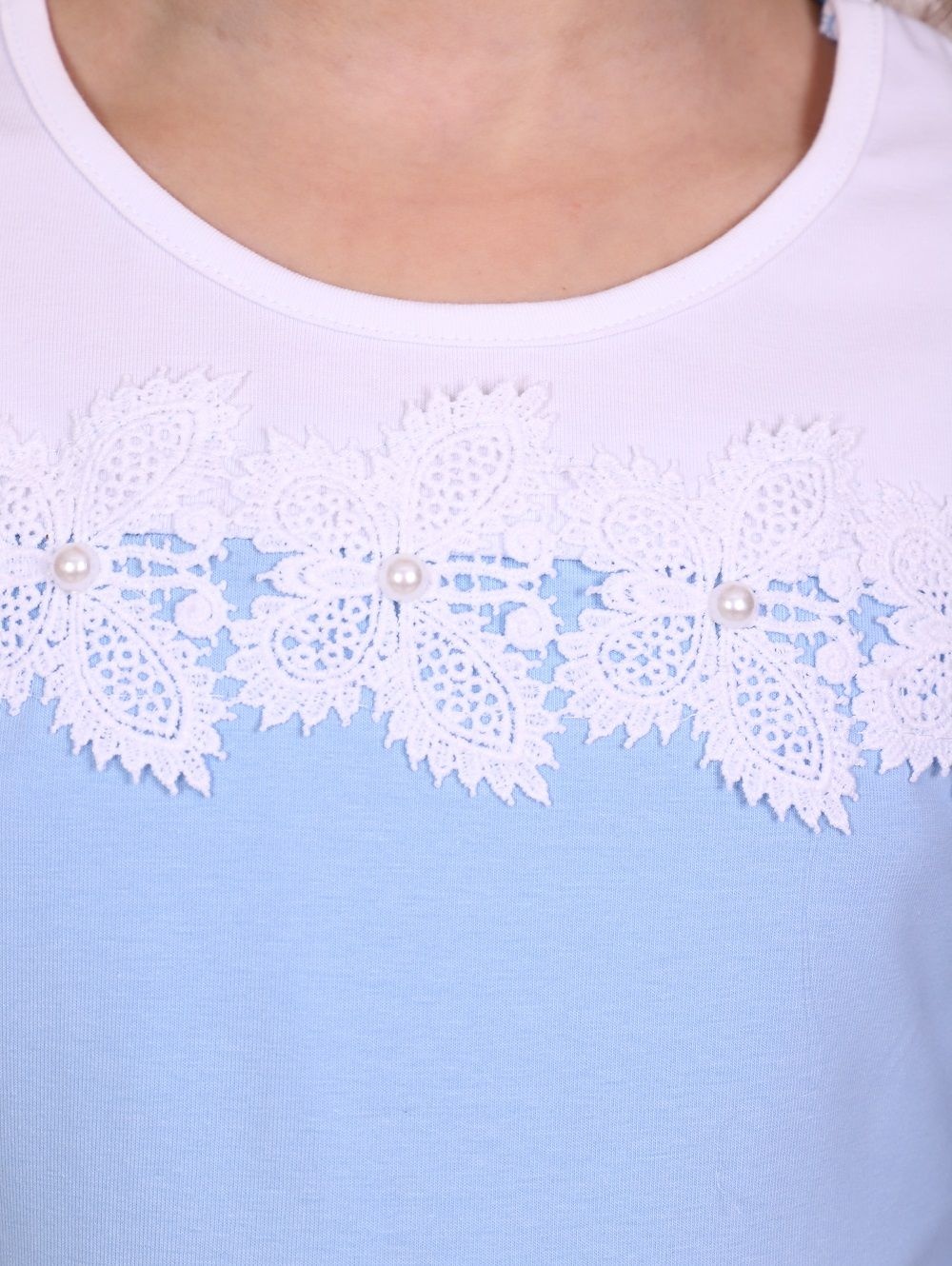 Джемпер для девочек младшего и старшего школьного возраста, из трикотажного полотна кулирка с лайкрой. Джемпер прилегающего силуэта, с втачным рукавом. Спереди кокетка. На шов притачивания кокетки к нижней части переда настрочено кружево и приклеены полубусины. На спинке отсутствуют линии членения. Рукав длинный с одним швом. Низ рукава и изделия подогнуты.