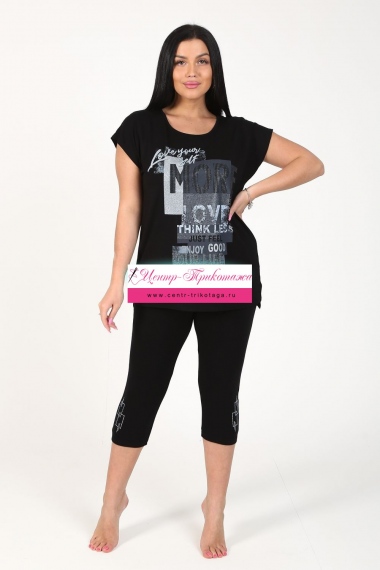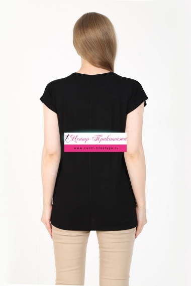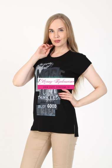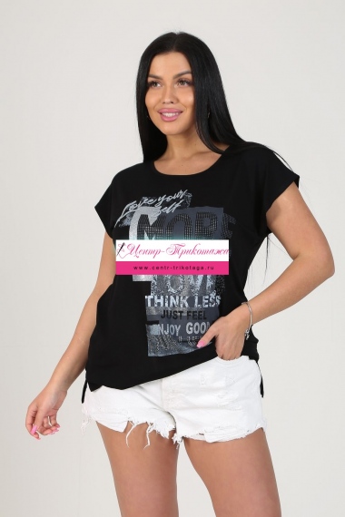 Модель свободного силуэта длиной до линии бёдер, со спущенной проймой. На передней части изделия нанесена стильная современная печать, боковой шов переходит в небольшой разрез, низ спереди чуть короче, чем спинка. Футболка изготовлена из приятной и комфортной вискозы, сочетается с любой одеждой.