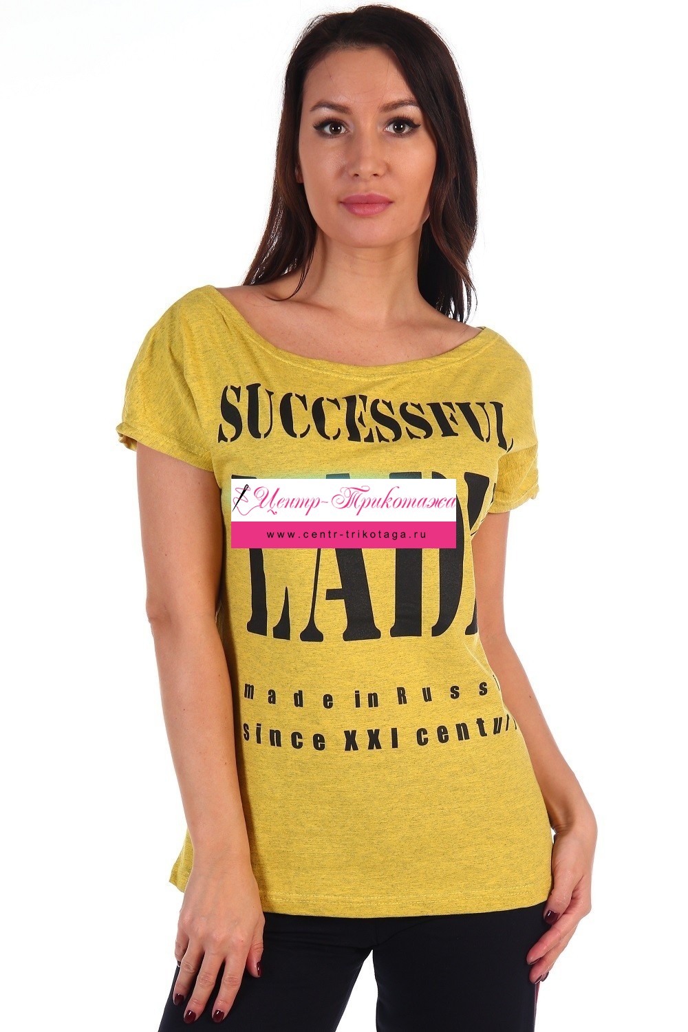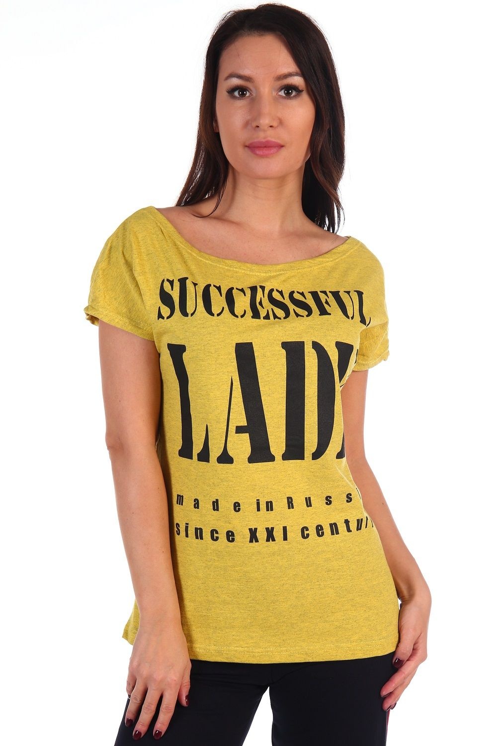 Стильная футболка из кулирки с широкой горловиной. Принт в виде надписей, несколько вариантов расцветки, окантовка в тон.