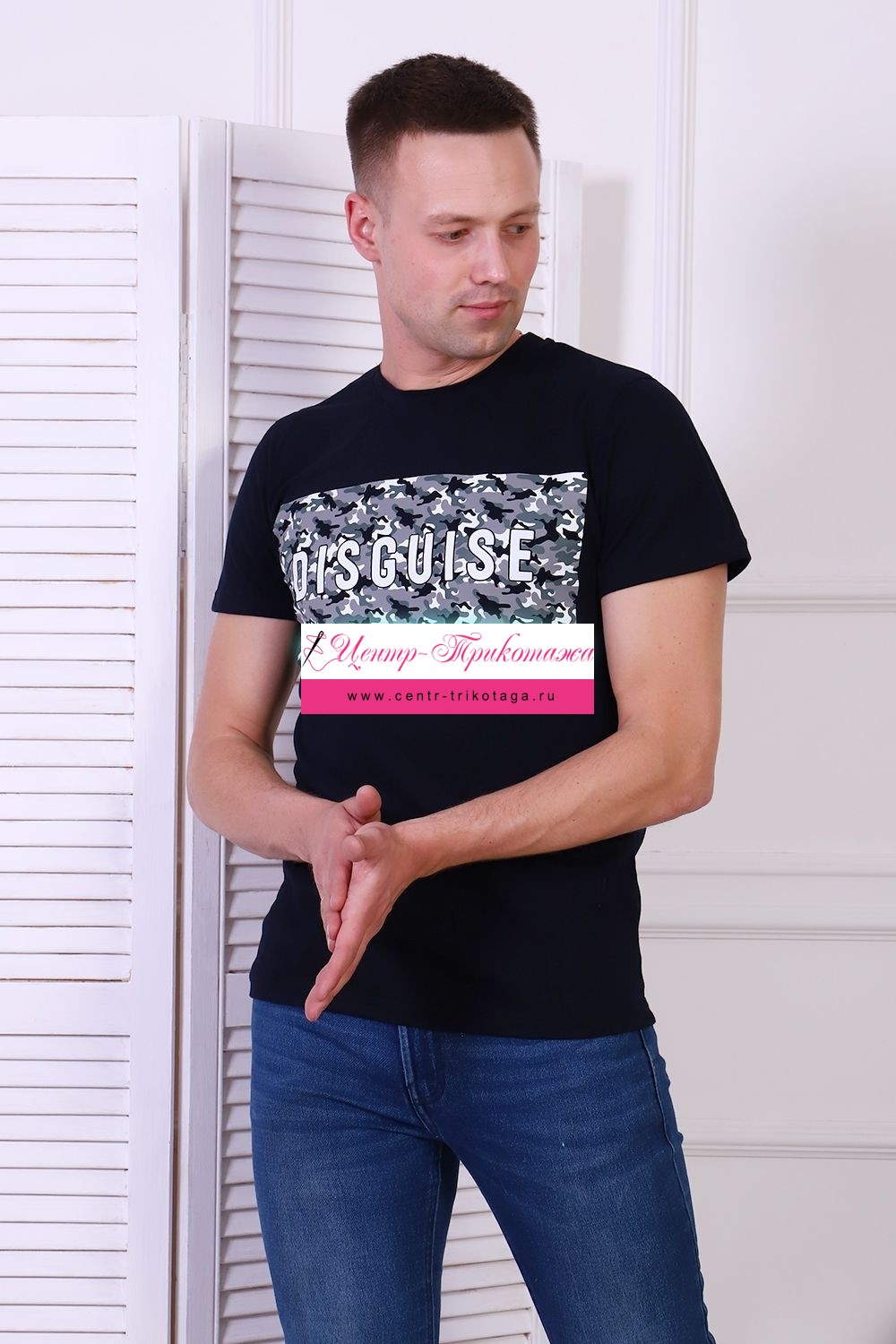 Футболка из трикотажной хлопковой кулирки. На полочке контрастный принт с камуфляжным рисунком и надписью, рукава короткие.