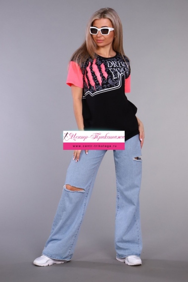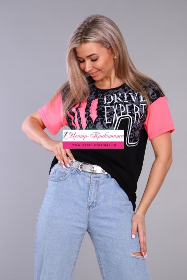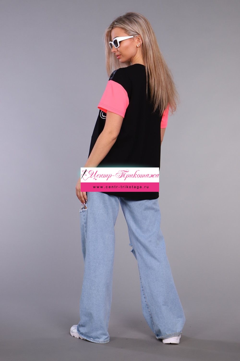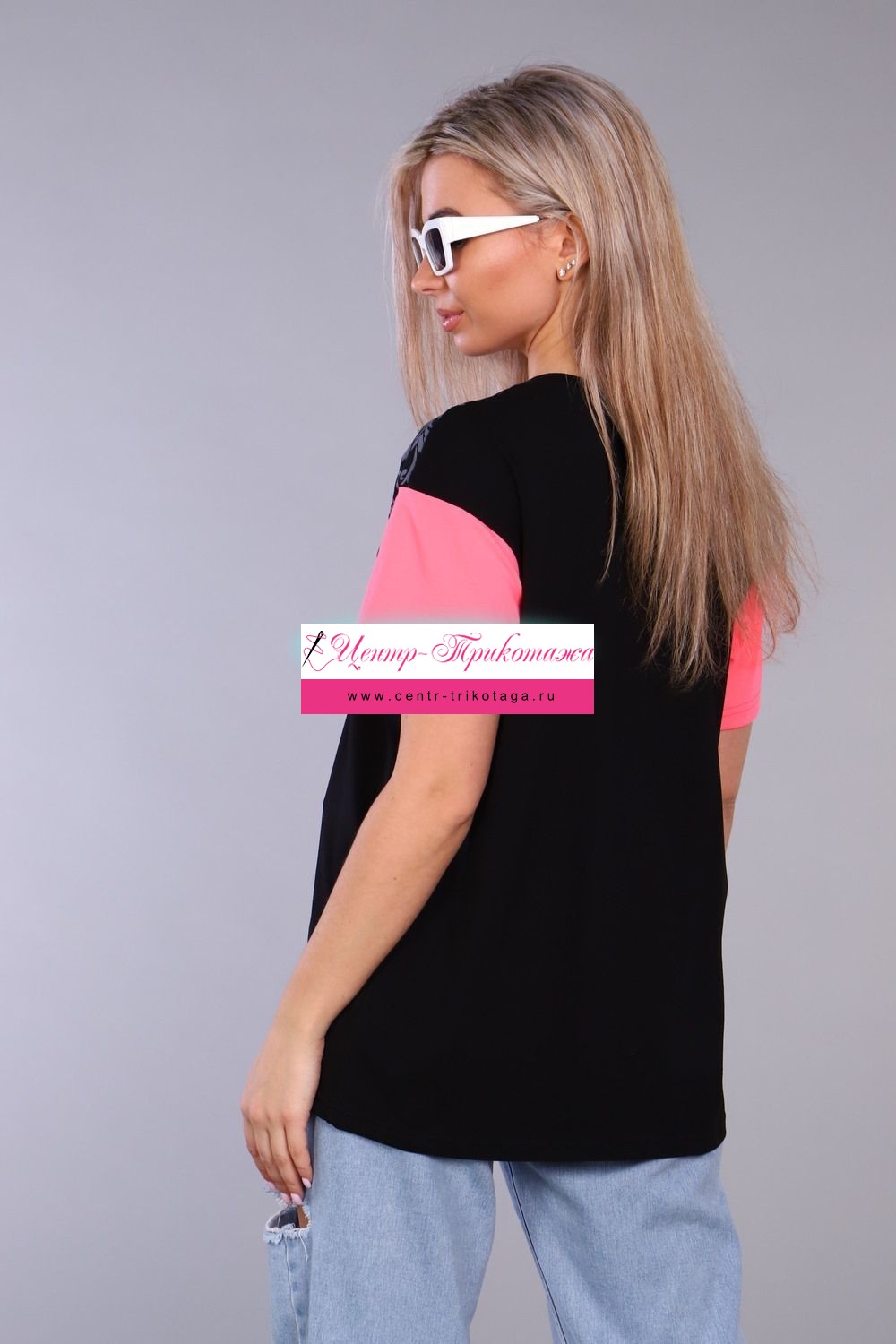 Футболка женская классическая прямого покроя, основной цвет черный, рукава 2 цветов - розового и зеленого. Оригинальный принт на полочке.