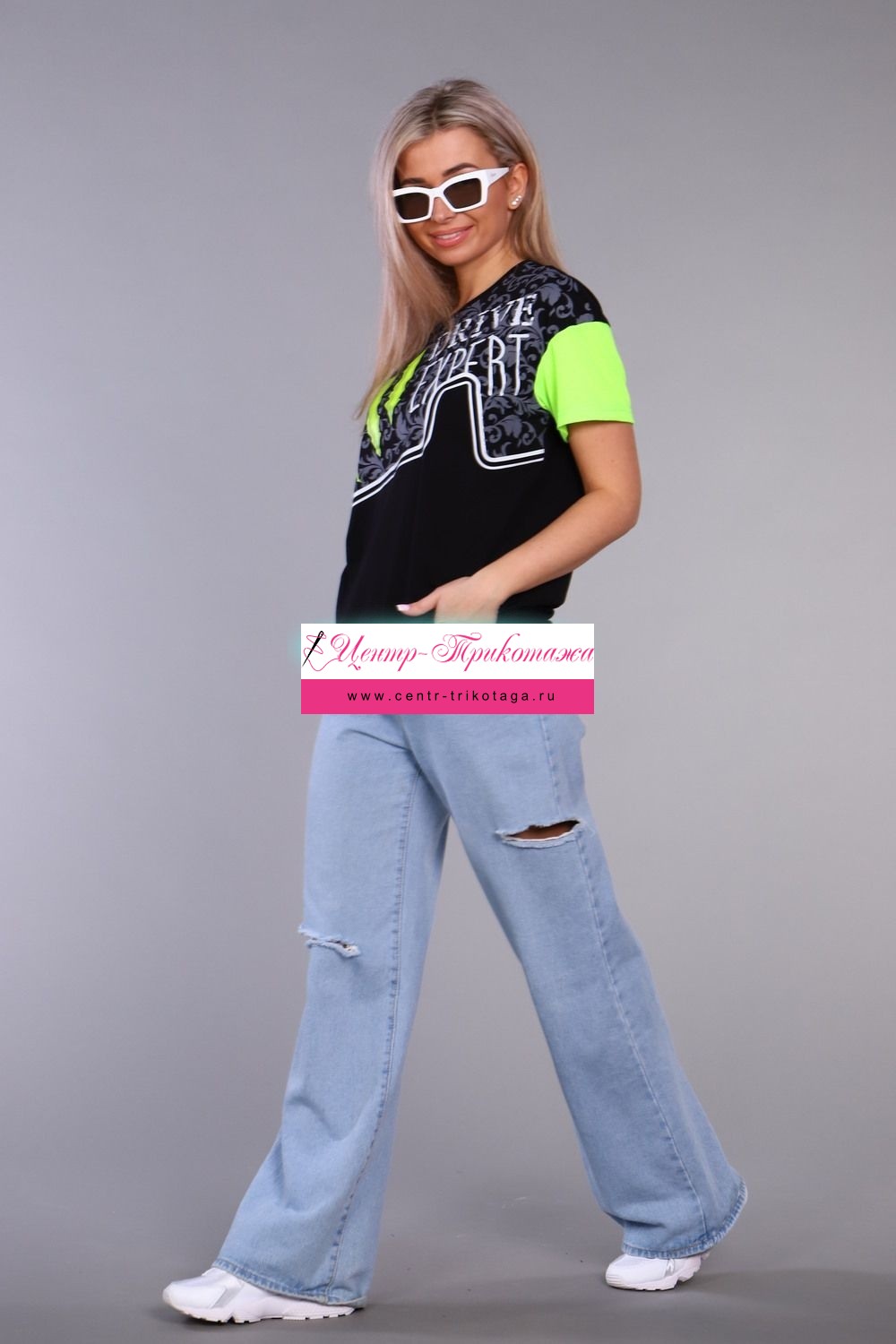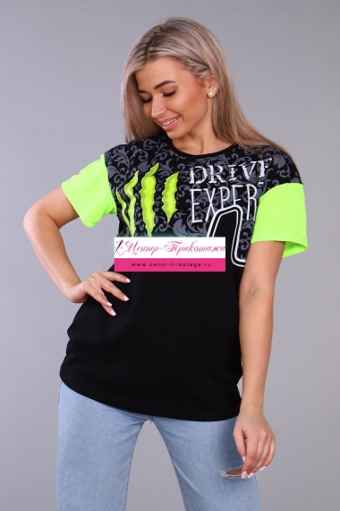 Футболка женская классическая прямого покроя, основной цвет черный, рукава 2 цветов - розового и зеленого. Оригинальный принт на полочке.