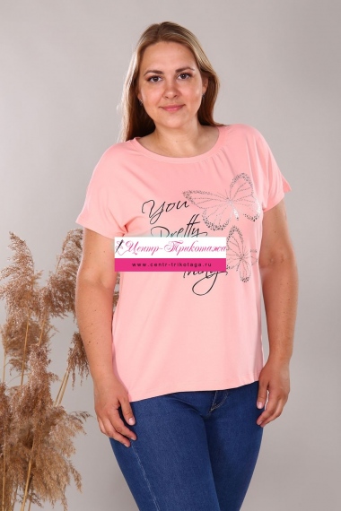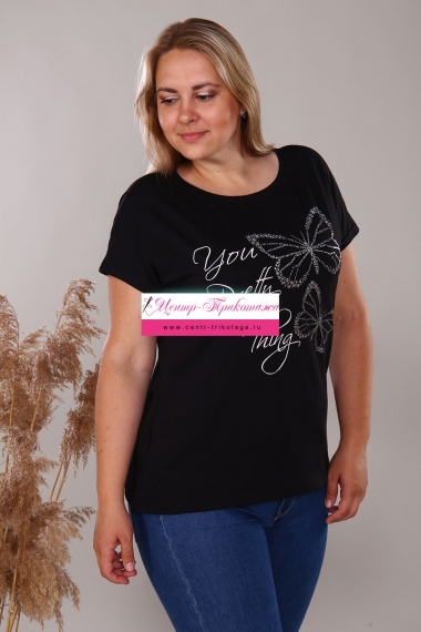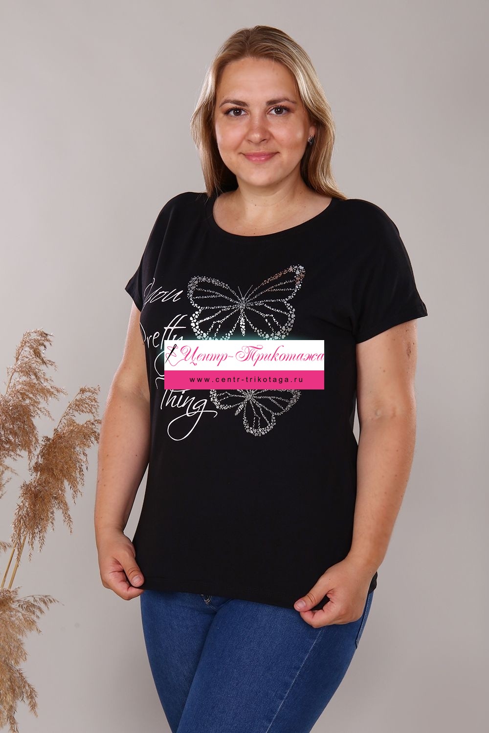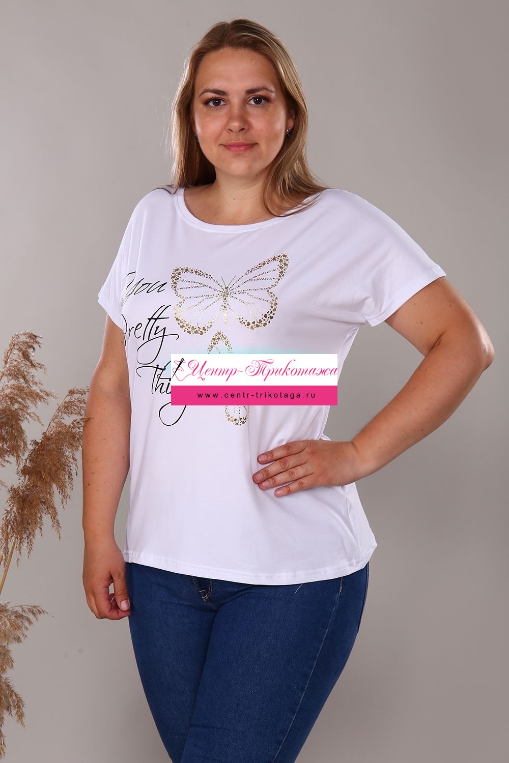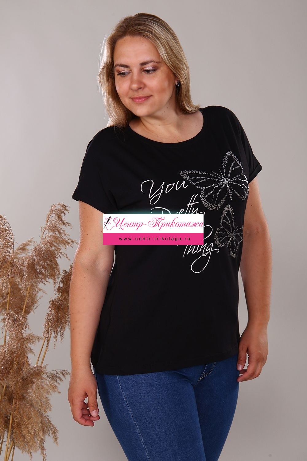 Футболка женская 48-60 свободного силуэта, с цельнокроенным спущенным рукавом. Спинка оформлена рельефами. Длина изделия до середины бедра. Полочка декорирована принтом в виде бабочки. Идеально подходит для гардероба с юбкой, так же с брюками.