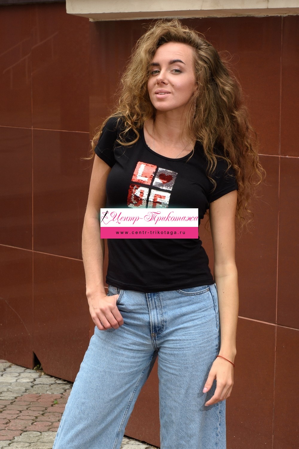 Футболка полуприлегающего силуэта, с округлой горловиной, длиной до середины бедра. Рукав втачной короткий. Горловина обработана бейкой из основного полотна. На полочке аппликация из пайеток