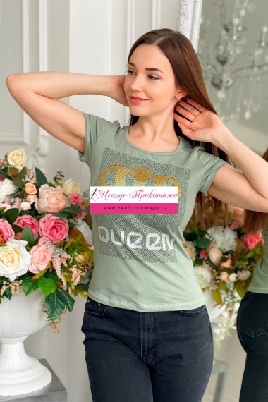 Футболка полуприлегающего силуэта, с округлой горловиной, длиной до середины бедра. Рукав втачной короткий. Горловина обработана бейкой из основного полотна. На полочке эффектная печать из пайеток