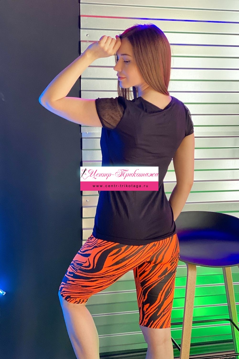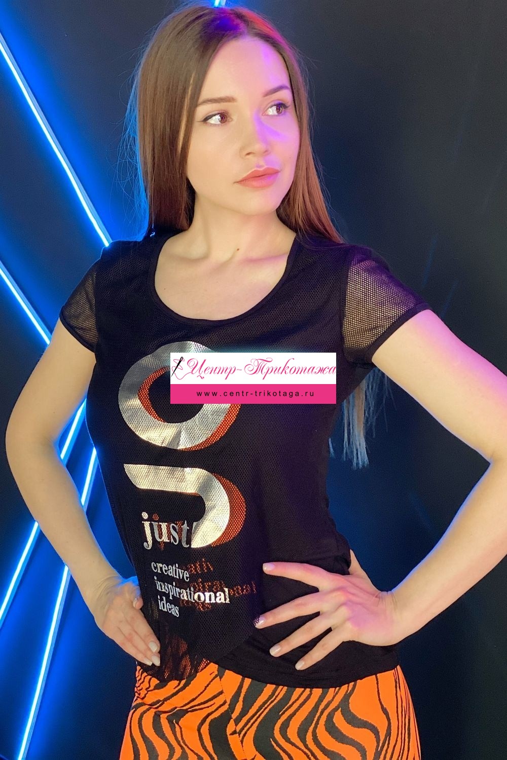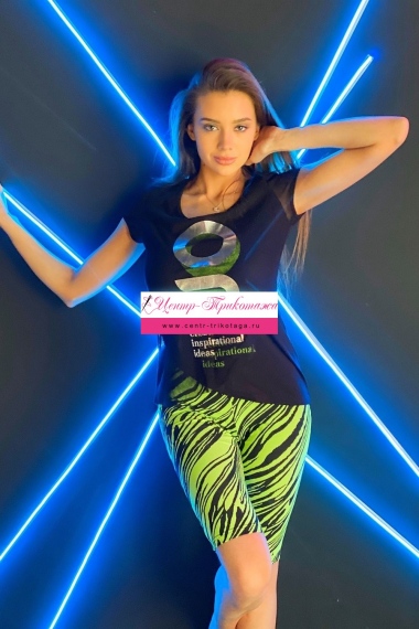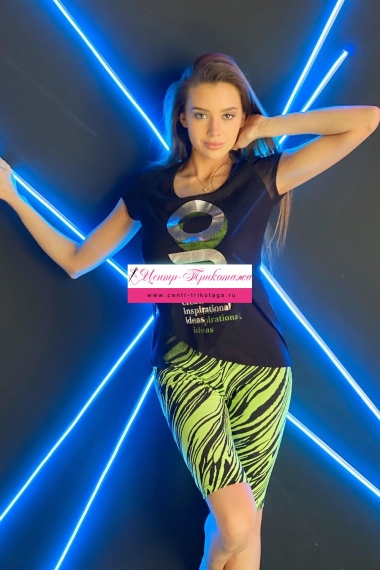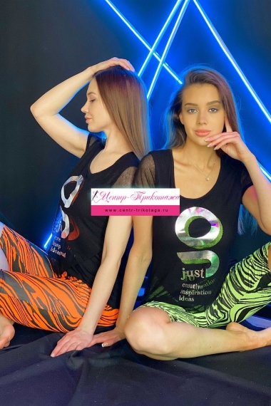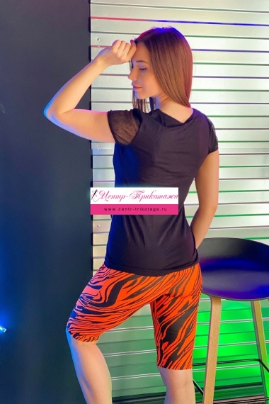 Футболка полуприлегающего силуэта, с округлой горловиной, длиной до середины бедра, с фигурным низом. Рукав втачной короткий, из сетки. Полочка выполнена из двух полотен, наложенных одно на другое. Верхнее полотно из сетки с принтом. Горловина обработана бейкой из основного полотна.