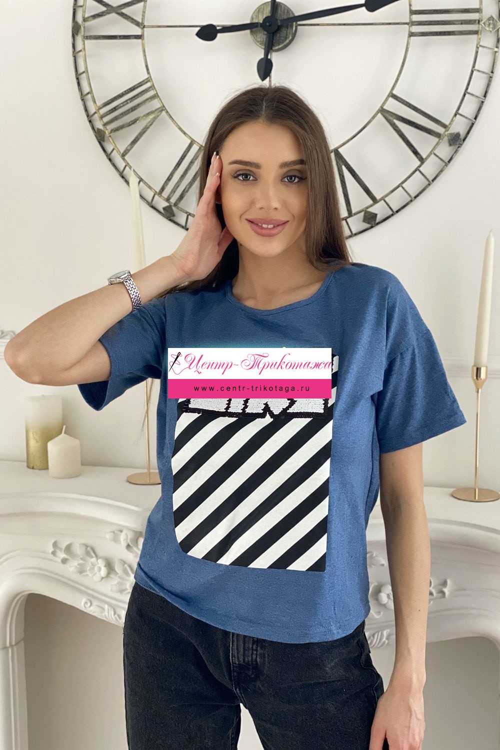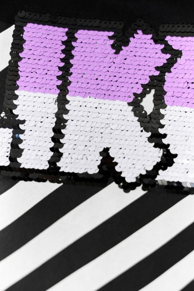 Футболка прямого силуэта, с округлой горловиной спереди и V-образной на спинке, с удлиненной спинкой. Рукав короткий. В верхней части спинки обработан фигурный вырез со шнуром. Горловина обработана бейкой из основного полотна. На полочке эффектная печать с пайетками