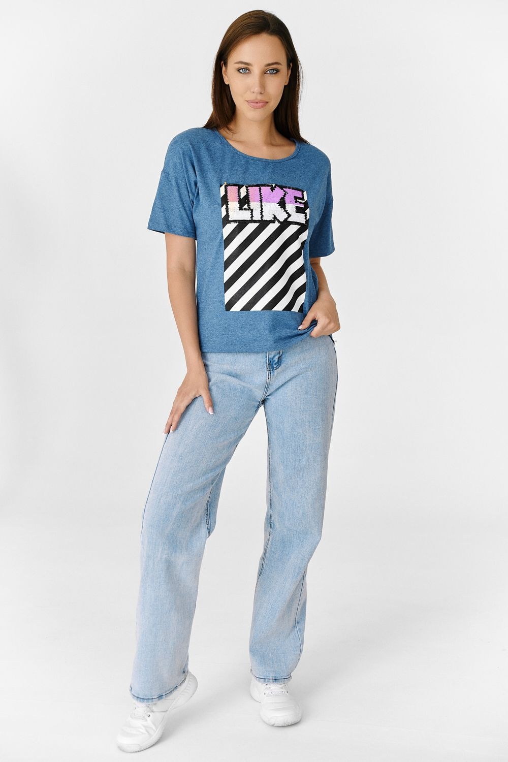 Футболка прямого силуэта, с округлой горловиной спереди и V-образной на спинке, с удлиненной спинкой. Рукав короткий. В верхней части спинки обработан фигурный вырез со шнуром. Горловина обработана бейкой из основного полотна. На полочке эффектная печать с пайетками