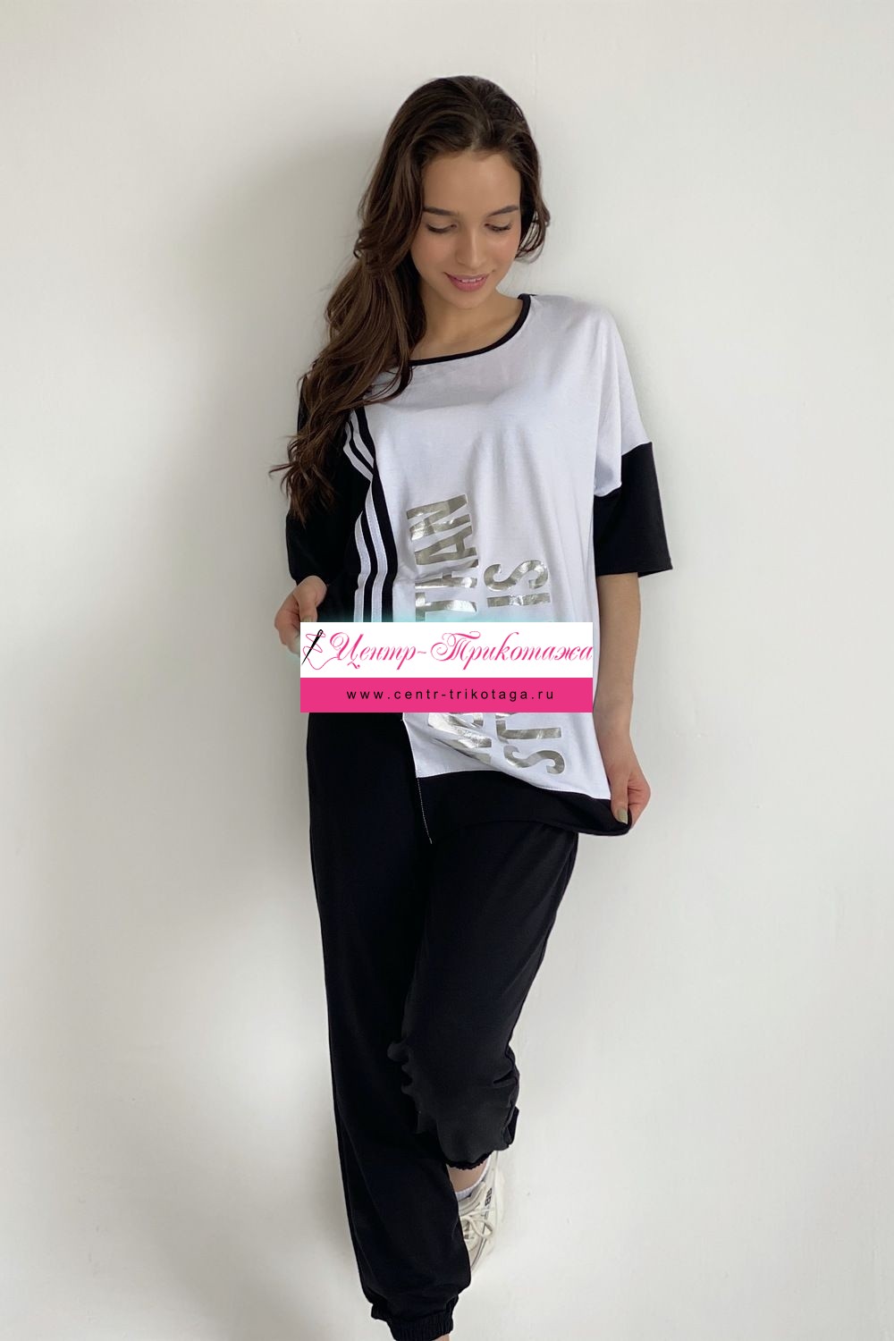 Футболка прямая, свободная, с округлой горловиной, с асимметричным низом. Рукав короткий. Центральная часть полочки выполнена из отделочного полотна. Вдоль шва соединения частей полочки расположены лампасы из отделочного полотна. Горловина обработана бейкой из основного полотна.