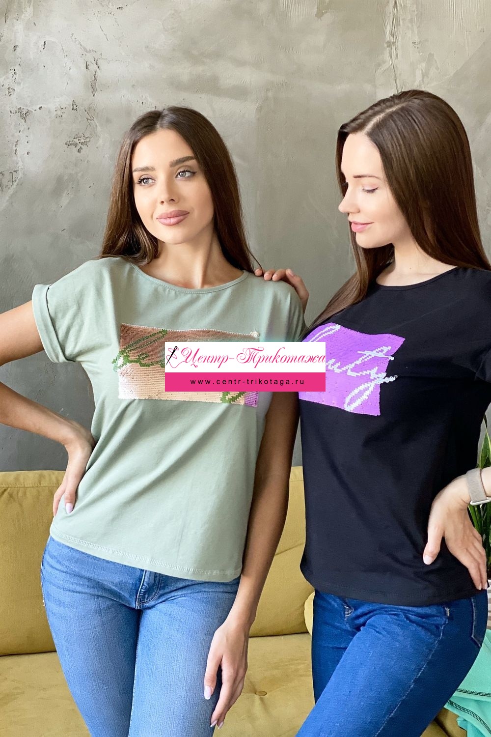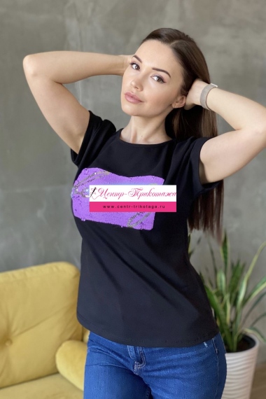Футболка полуприлегающего силуэта, средней длины, с округлой горловиной. Рукав цельнокроеный, короткий, на манжете с отворотом. На полочке блестящая аппликация из пайеток