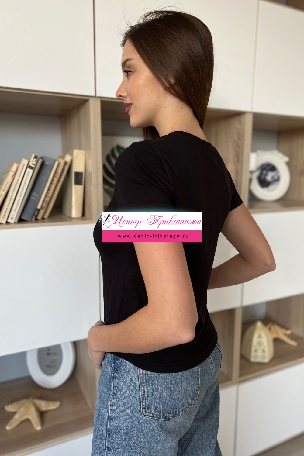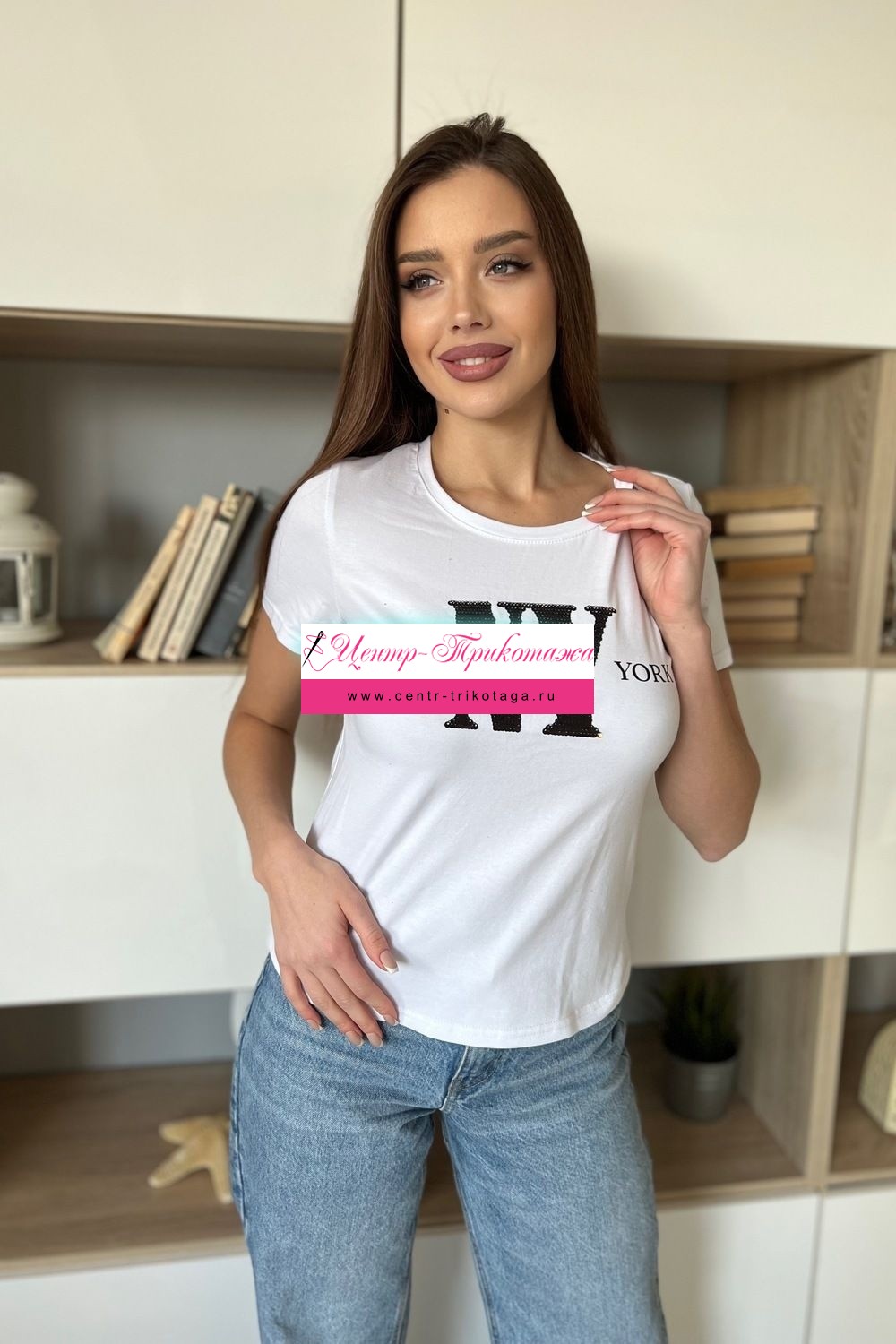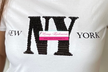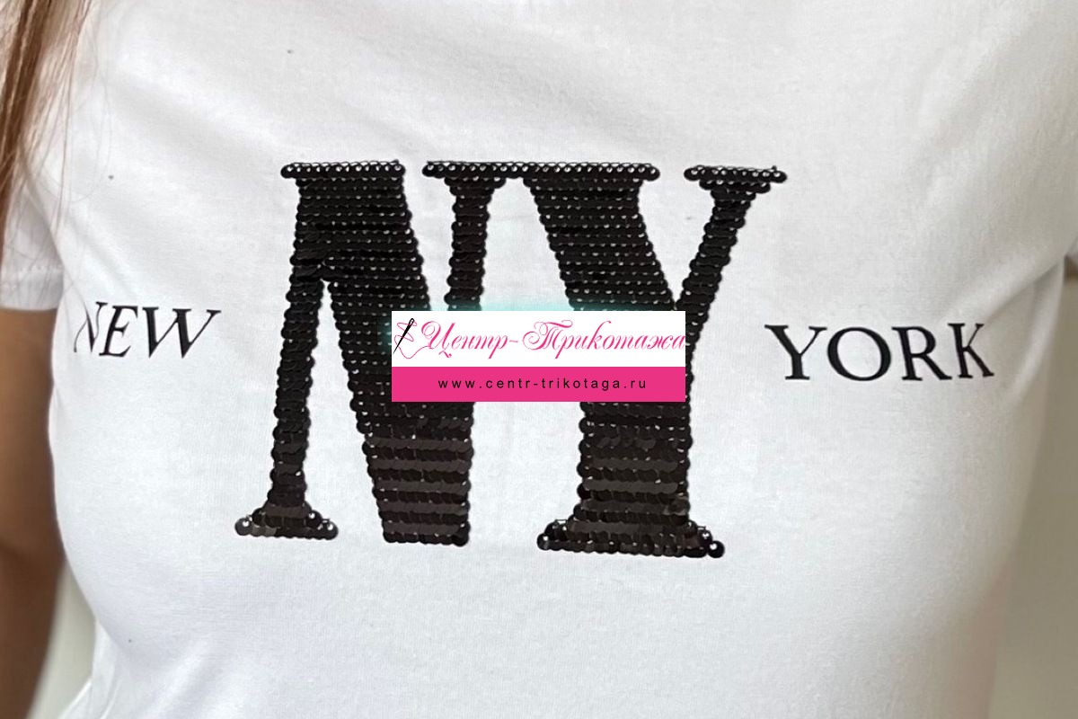 Футболка прямого силуэта, с фигурной линией низа, с округлой горловиной. Рукав втачной, короткий. Горловина обработана обтачкой из основного полотна. На полочке эффектно сочетаются аппликация из пайеток в виде букв NY и печать New York