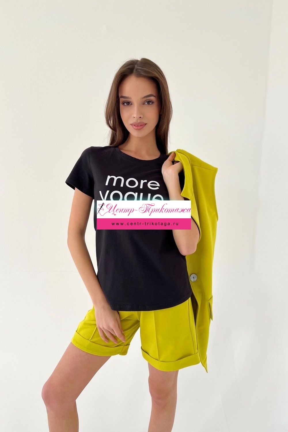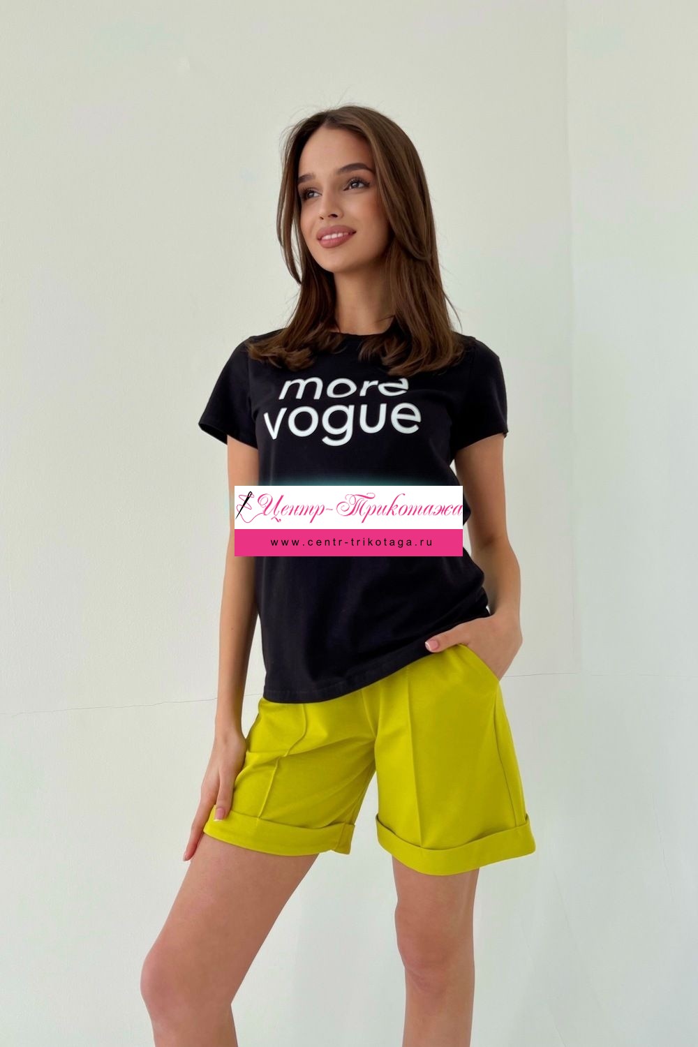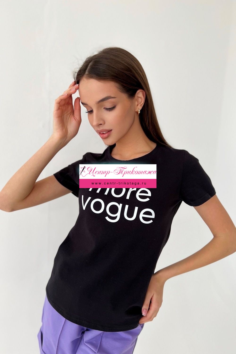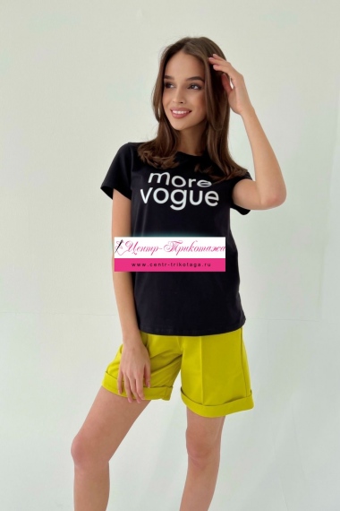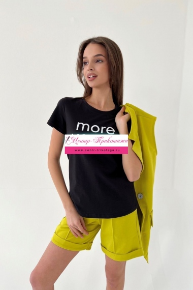 Футболка прямого силуэта, с округлой горловиной, длиной до середины бедра. Рукав втачной, короткий. Горловина обработана обтачкой из основного полотна.