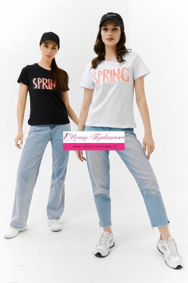 Футболка прямого силуэта, с округлой горловиной, длиной до середины бедра. Рукав втачной, короткий. Горловина обработана бейкой из основного полотна. На полочке эффектная переливающаяся аппликация с пайетками