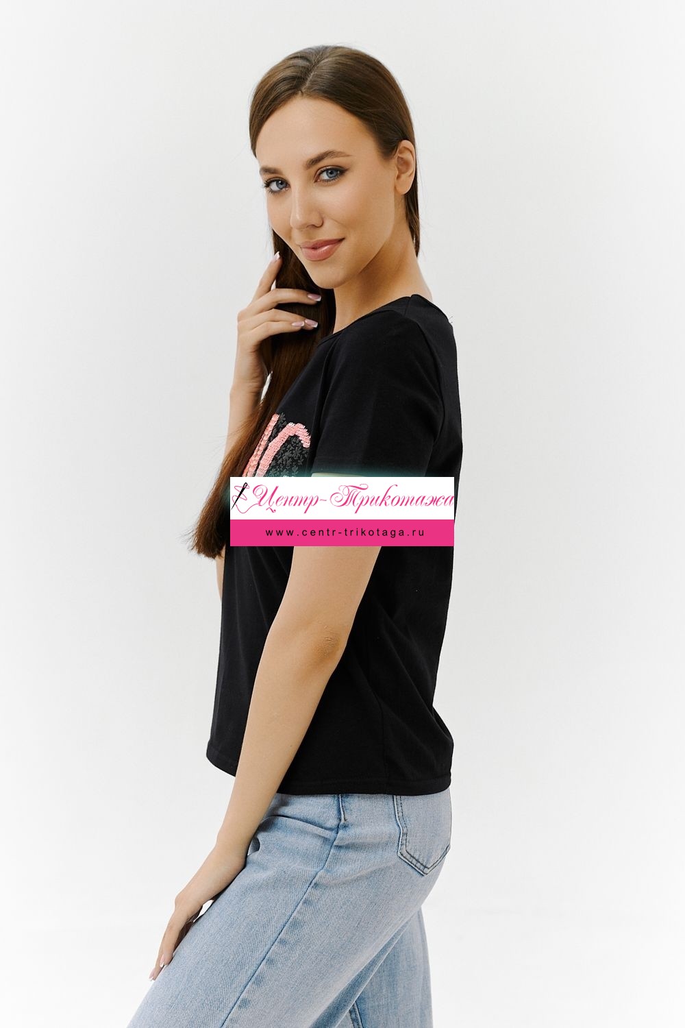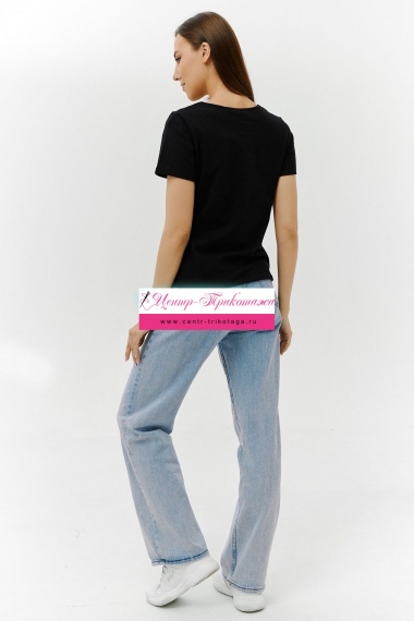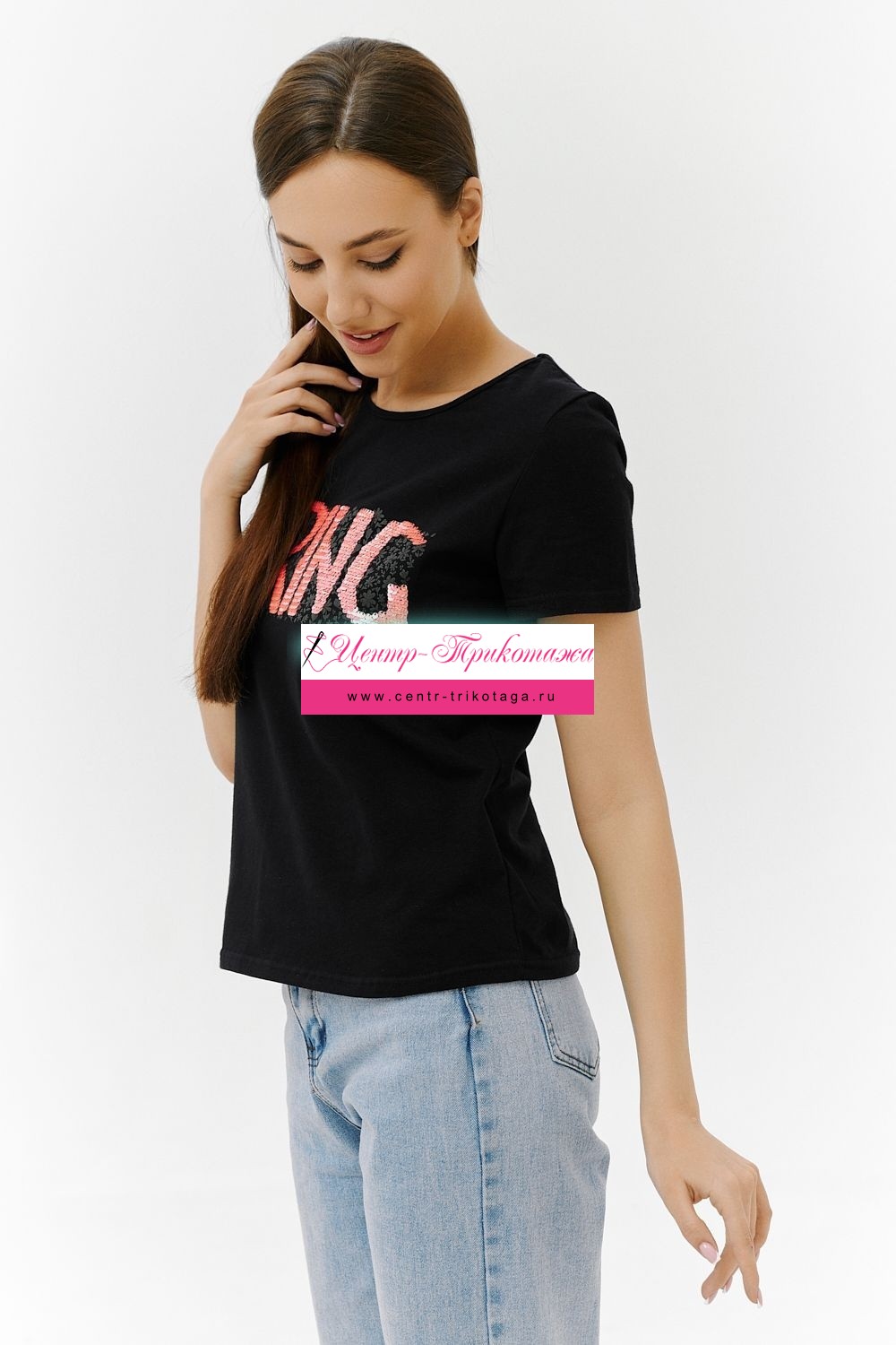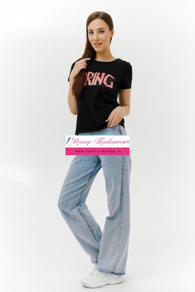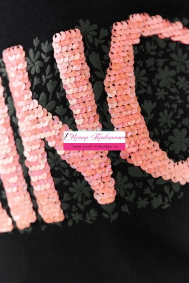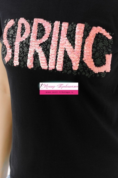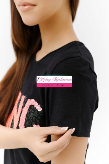 Футболка прямого силуэта, с округлой горловиной, длиной до середины бедра. Рукав втачной, короткий. Горловина обработана бейкой из основного полотна. На полочке эффектная переливающаяся аппликация с пайетками