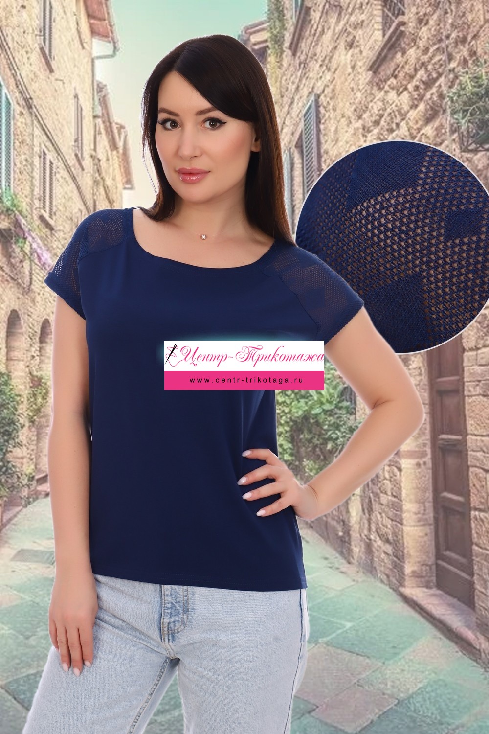 Футболка женская свободного покроя из комбинированного трикотажного полотна - кулирки с лайкрой ПЕНЬЕ и ажурного трикотажа. Спущенная пройма, реглан из ажурного трикотажа, вырез горловины в виде лодочки , низ спинки слегка удлинён и закруглён.